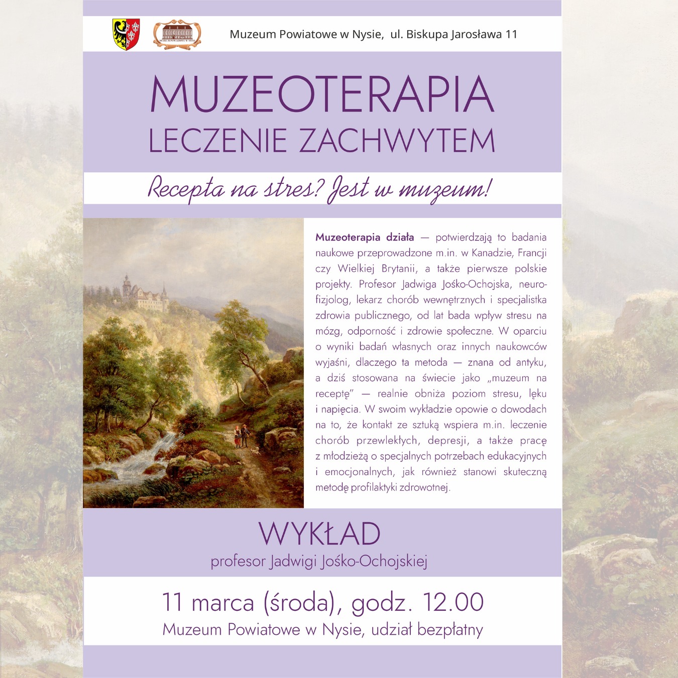Zapraszamy na wykład 11 marca o godzinie 12.00 – „Muzeoterapia. Leczenie zachwytem”, który poprowadzi profesor zwyczajny, doktor habilitowana nauk medycznych, Jadwiga Jośko‑Ochojska — lekarz chorób wewnętrznych, neurofizjolog i specjalistka zdrowia publicznego.