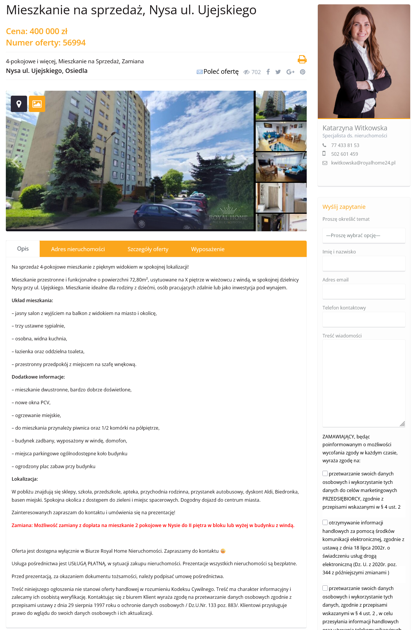 Na stronie Royal Home Nieruchomości pojawiło się nowe ogłoszenie dotyczące sprzedaży 4-pokojowego mieszkania w Nysie.