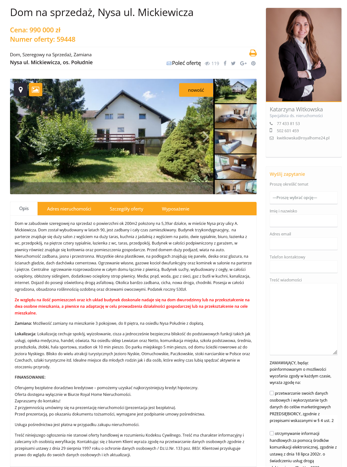 Na stronie Royal Home Nieruchomości pojawiło się nowe ogłoszenie dotyczące sprzedaży domu w Nysie przy ulicy Mickiewicza.