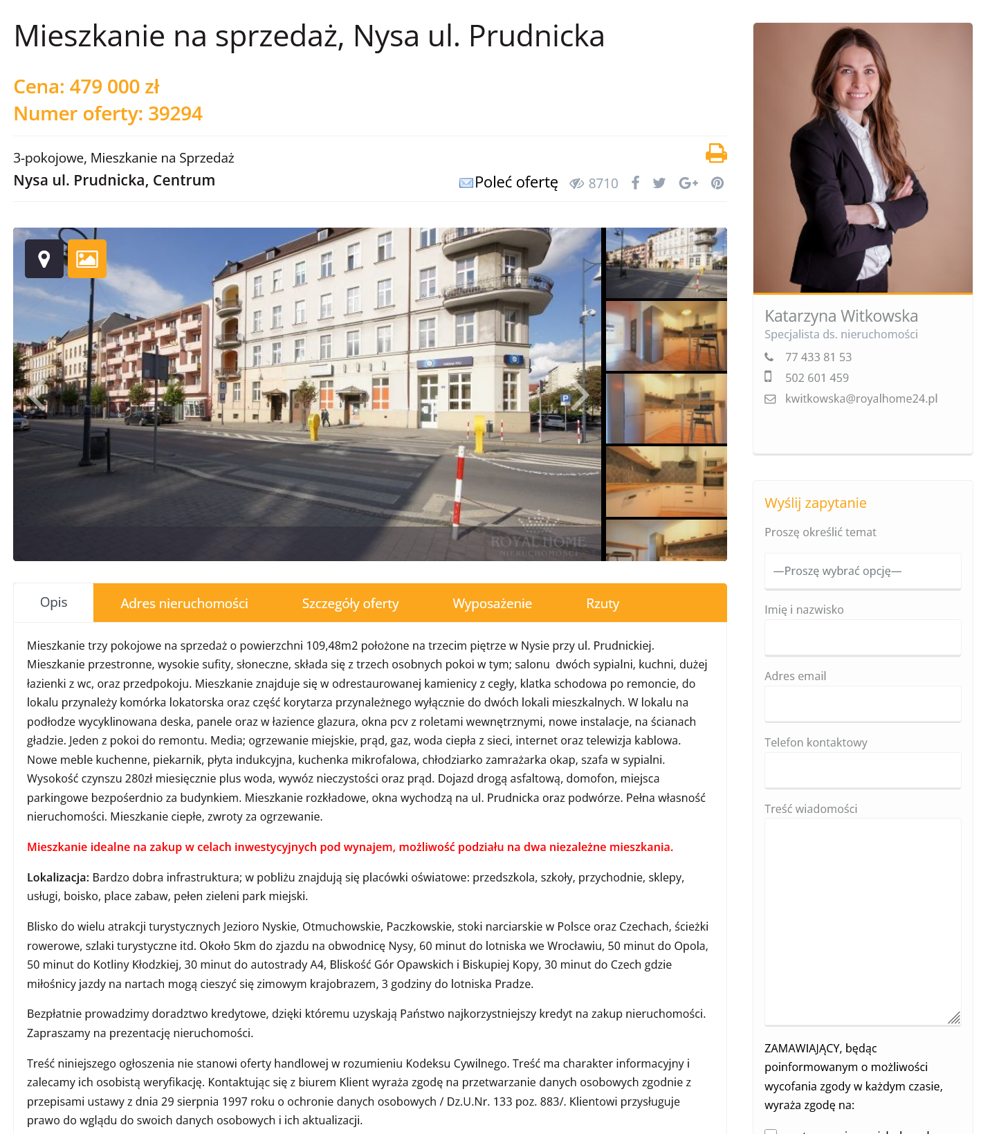 Na stronie Royal Home Nieruchomości dostępne jest ogłoszenie sprzedaży mieszkania 3-pokojowego przy ulicy Prudnickiej w Nysie.
