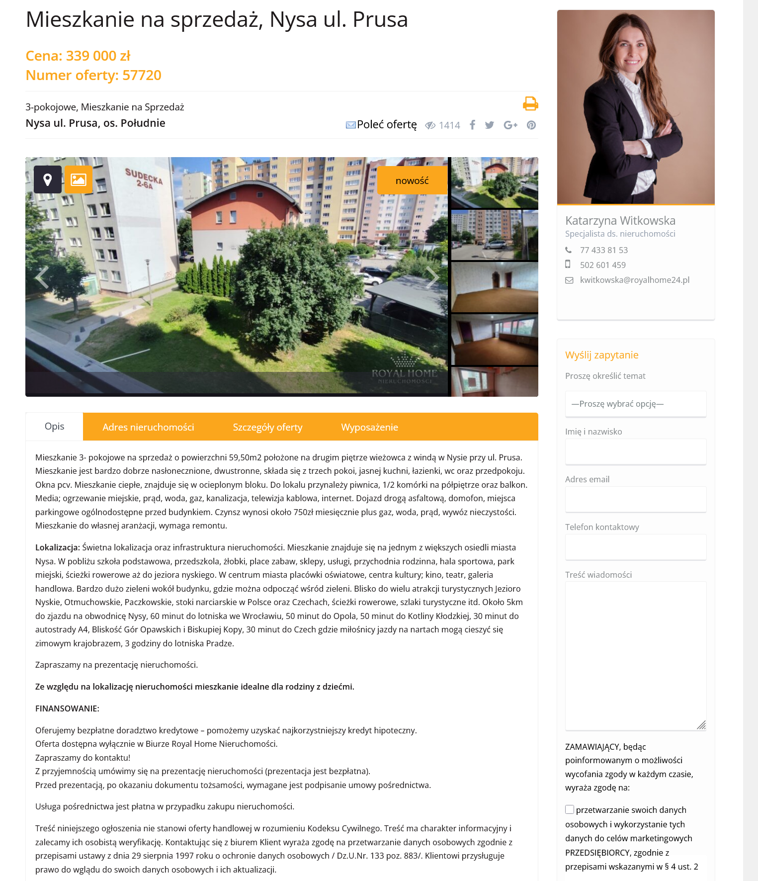 Na stronie Royal Home Nieruchomości zostało zamieszczone nowe ogłoszenie dotyczące sprzedaży 3-pokojowego mieszkania w Nysie przy ulicy Prusa.