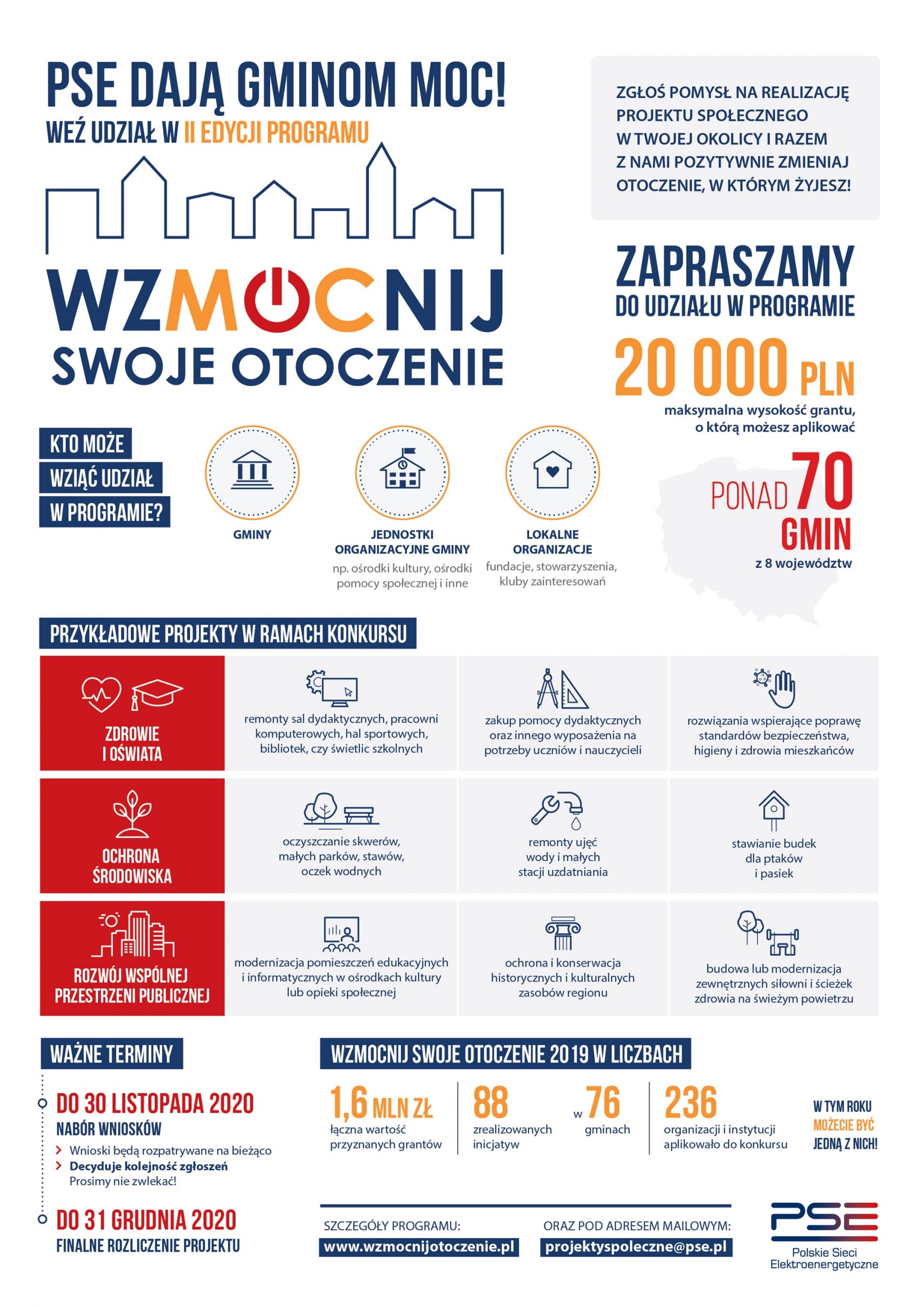 Trwa nabór wniosków do II edycji „WzMOCnij swoje otoczenie” – programu granatowego organizowanego przez Polskie Sieci Elektroenergetyczne, który jest realizowany do końca br. O granty społeczne może ubiegać się samorząd, jego jednostki budżetowe oraz organizacje pozarządowe działające w gminie Nysa. Formularz zgłoszeniowy jest dostępny na stronie www.wzmocnijotoczenie.pl.
