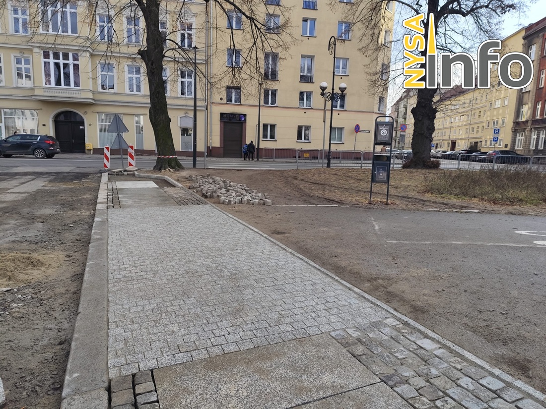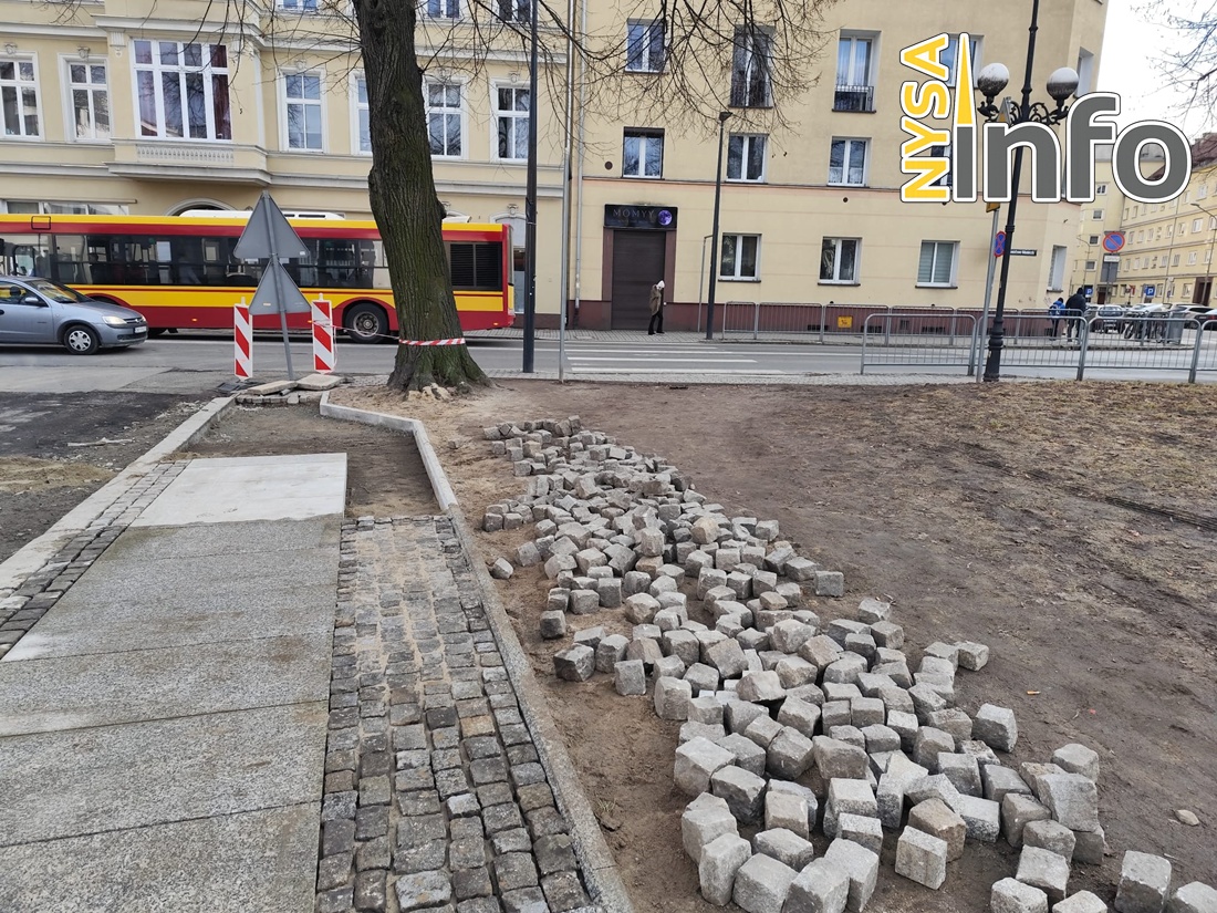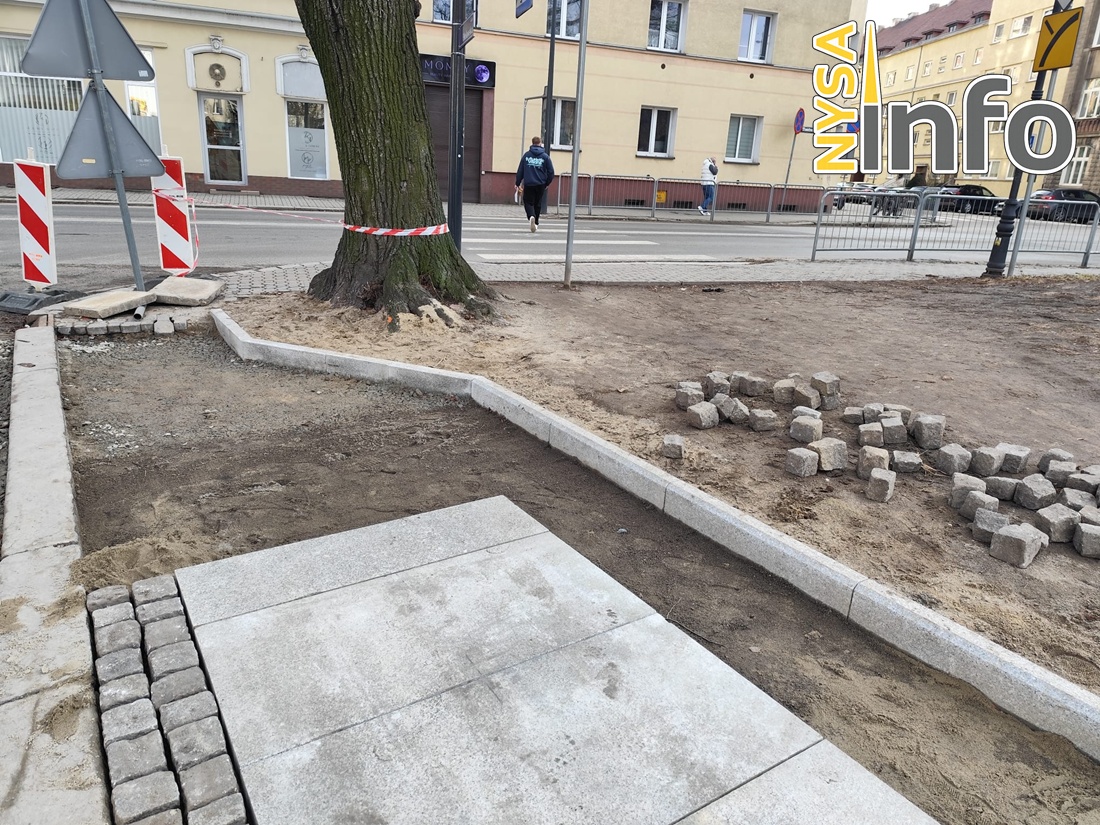 Od strony skrzyżowania z ulicą Moniuszki widać już pierwsze nowe elementy. Układane są duże płyty granitowe, a boczne pasy wypełniane są drobniejszą kostką – podobnie jak w przypadku innych traktów pieszych remontowanych w nyskim śródmieściu.
