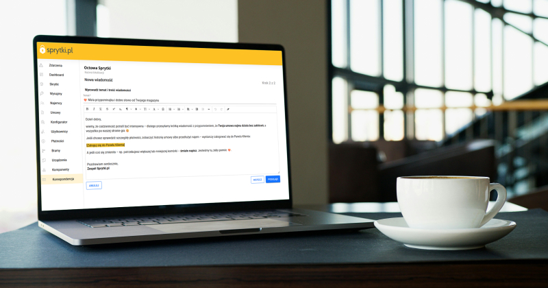 - Automatyczne komunikaty – przypomnienia o płatnościach wysyłane są automatycznie. Ale oprócz tego można wysyłać maile do najemców, np. z informacją o nowościach w magazynie – jednym klikiem od razu do wszystkich.