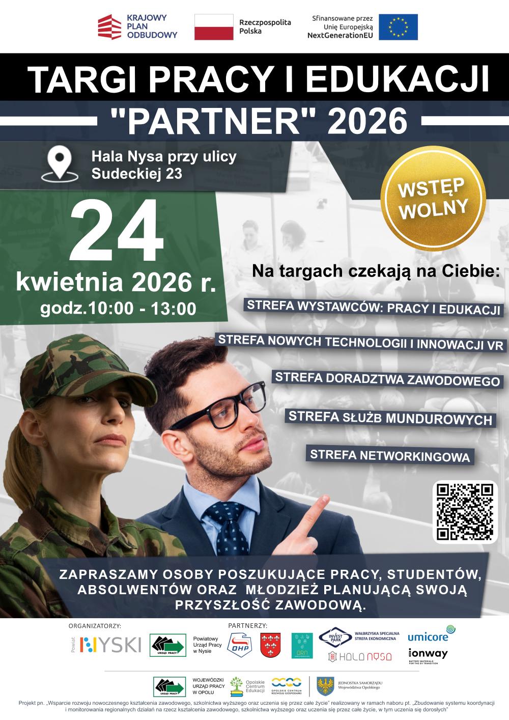 Targi Pracy i Edukacji PARTNER 2026, organizowane w ramach projektu pn. „Wsparcie rozwoju nowoczesnego kształcenia zawodowego, szkolnictwa wyższego oraz uczenia się przez całe życie”, realizowanego ze środków Krajowego Planu Odbudowy i Zwiększania Odporności (KPO).