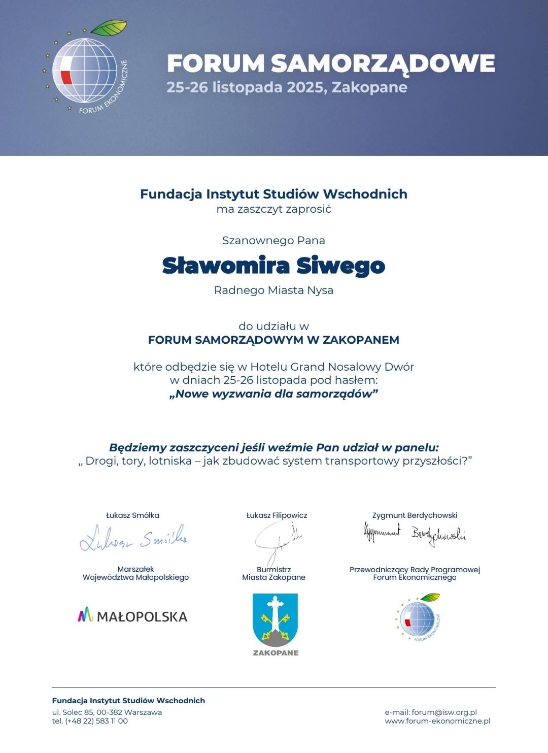 W dniu dzisiejszym biorę udział w panelu dyskusyjnym o nazwie “Drogi, tory, lotniska – jak zbudować system transportowy przyszłości” na Forum Samorządowym w Zakopanem – informuje w mediach społecznościowych randy.
