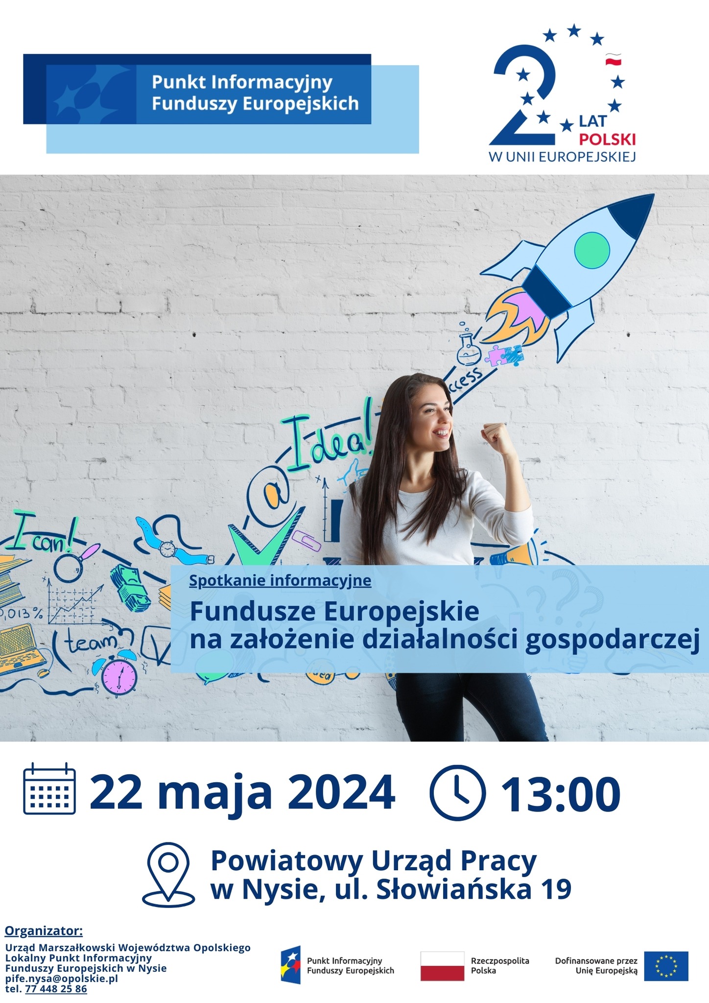 Sieć Punktów Informacyjnych Funduszy Europejskich w województwie opolskim serdecznie zaprasza na spotkanie informacyjne pn. Fundusze Europejskie na rozpoczęcie działalności gospodarczej, które odbędzie się 22 maja 2024 r. o godz. 13:00 w Nysie, Pracownia Rozwoju Zawodowego, Powiatowy Urząd Pracy w Nysie, ul. Słowiańska 19 (wejście od strony Lewiatana).