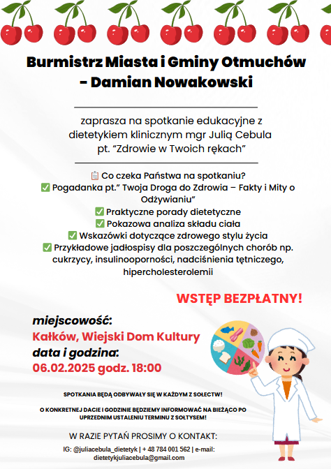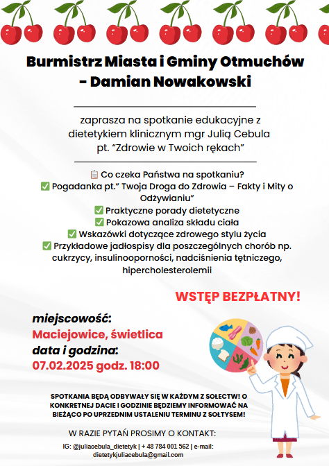 Burmistrz Miasta i Gminy Otmuchów – Damian Nowakowski zaprasza na spotkanie edukacyjne z dietetykiem klinicznym mgr Julią Cebula pt. Zdrowie w Twoich rękach.