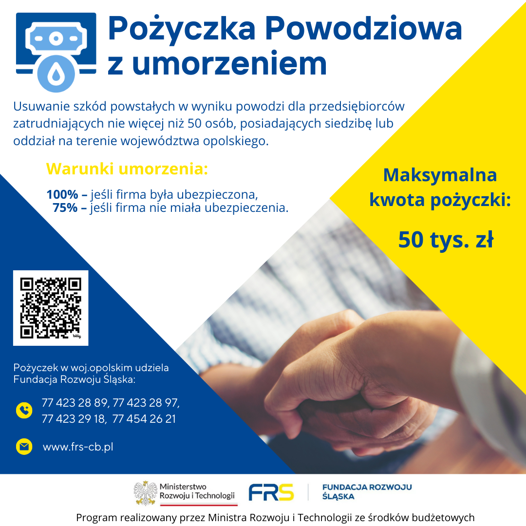 Fundacja Rozwoju Śląska przypomina przedsiębiorcom z województwa opolskiego poszkodowanym przez powódź o możliwości uzyskania wsparcia finansowego na usuwanie skutków powodzi. Kwota pożyczki to maksymalnie 50 000 zł, a umorzenie może wynosić nawet 100%!