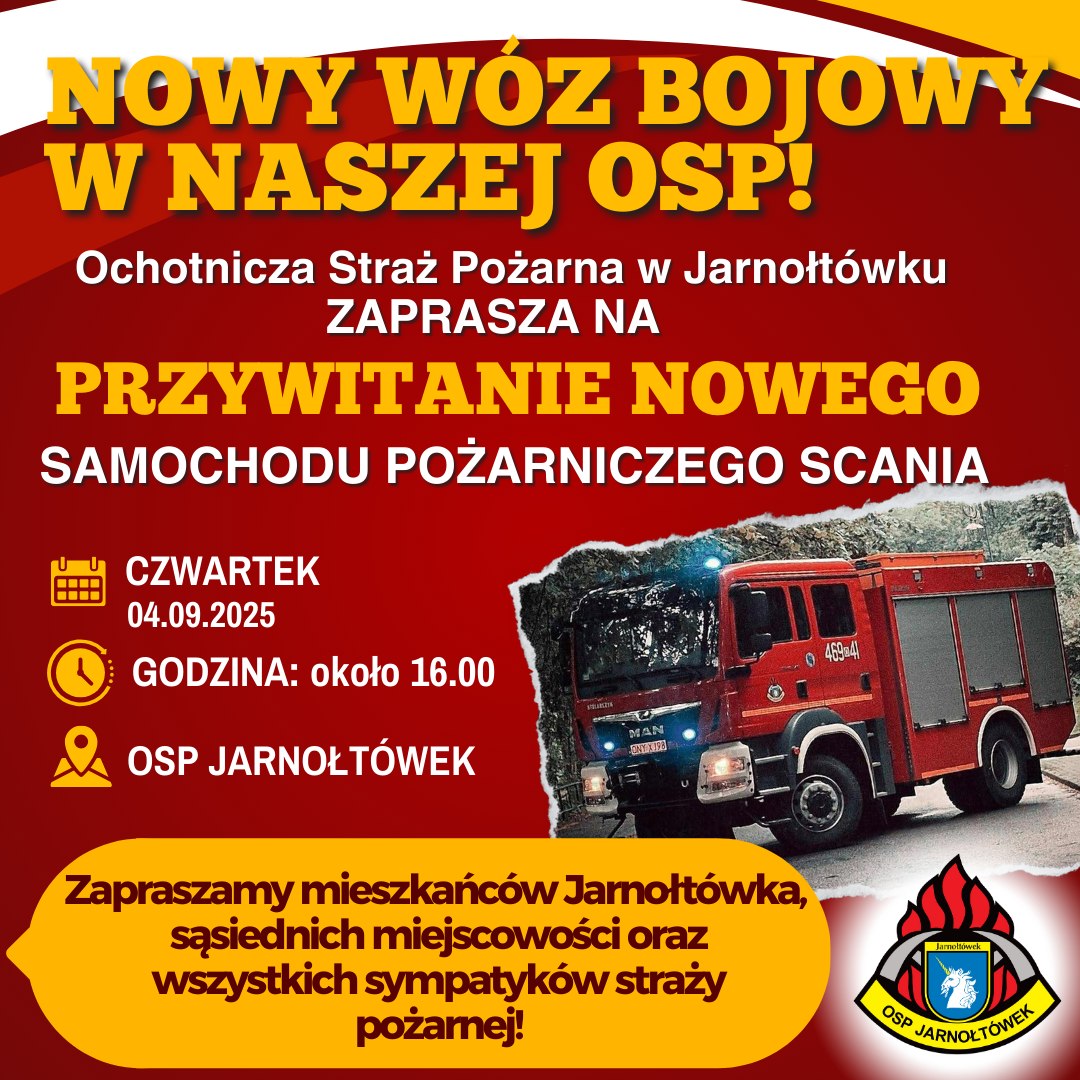 Ochotnicza Straż Pożarna w Jarnołtówku serdecznie zaprasza na uroczyste przywitanie nowego wozu bojowego! Wydarzenie będzie miało miejsce w Jarnołtówku – przy remizie OSP.