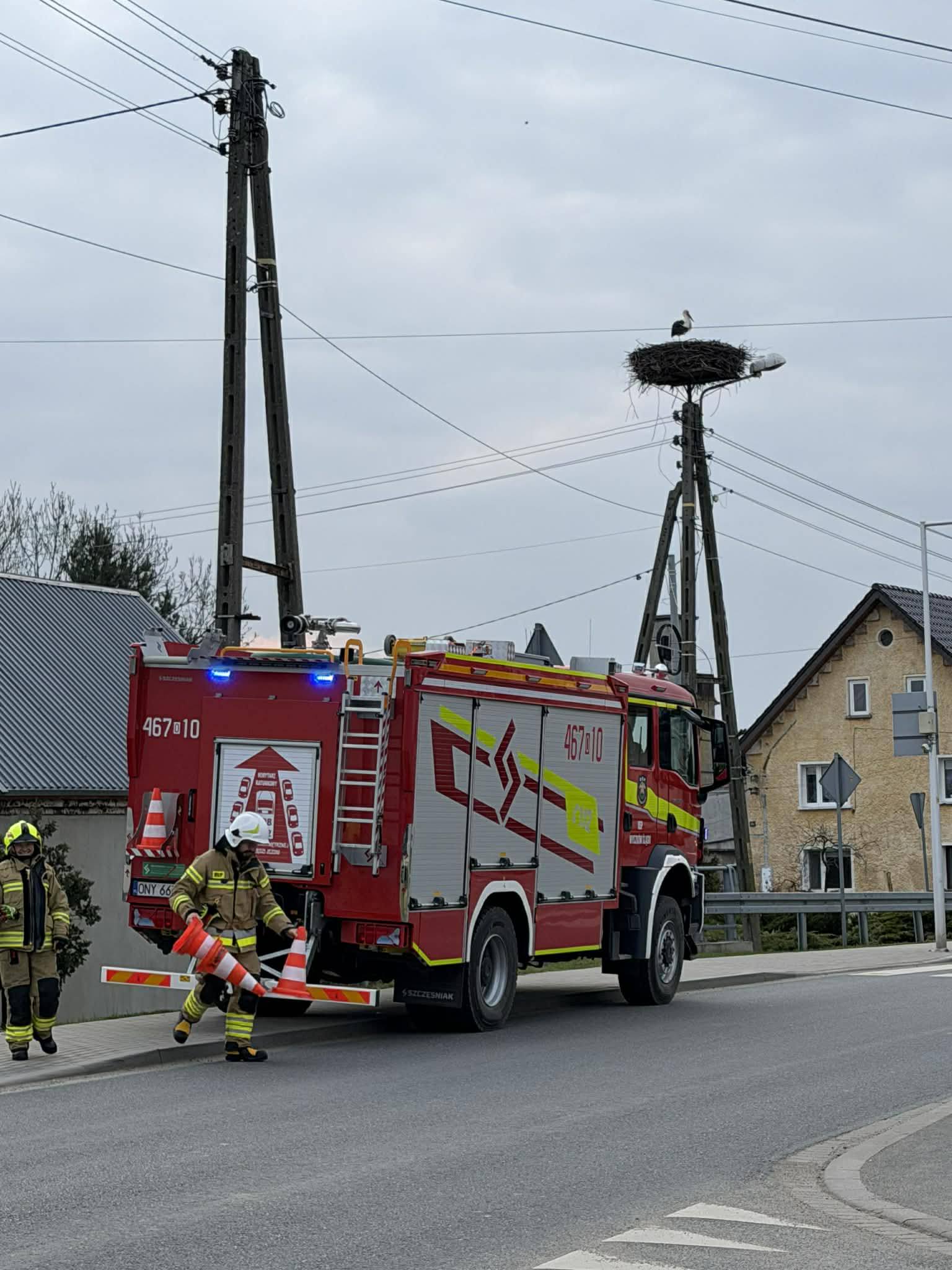 Niemal każdy kierowca, który przejeżdża przez Wyszków Śląski zerka na wysoki słup na którym jest zlokalizowane gniazdo bocianów. Dziś konieczna była interwencja OSP Wyszków Śląski.