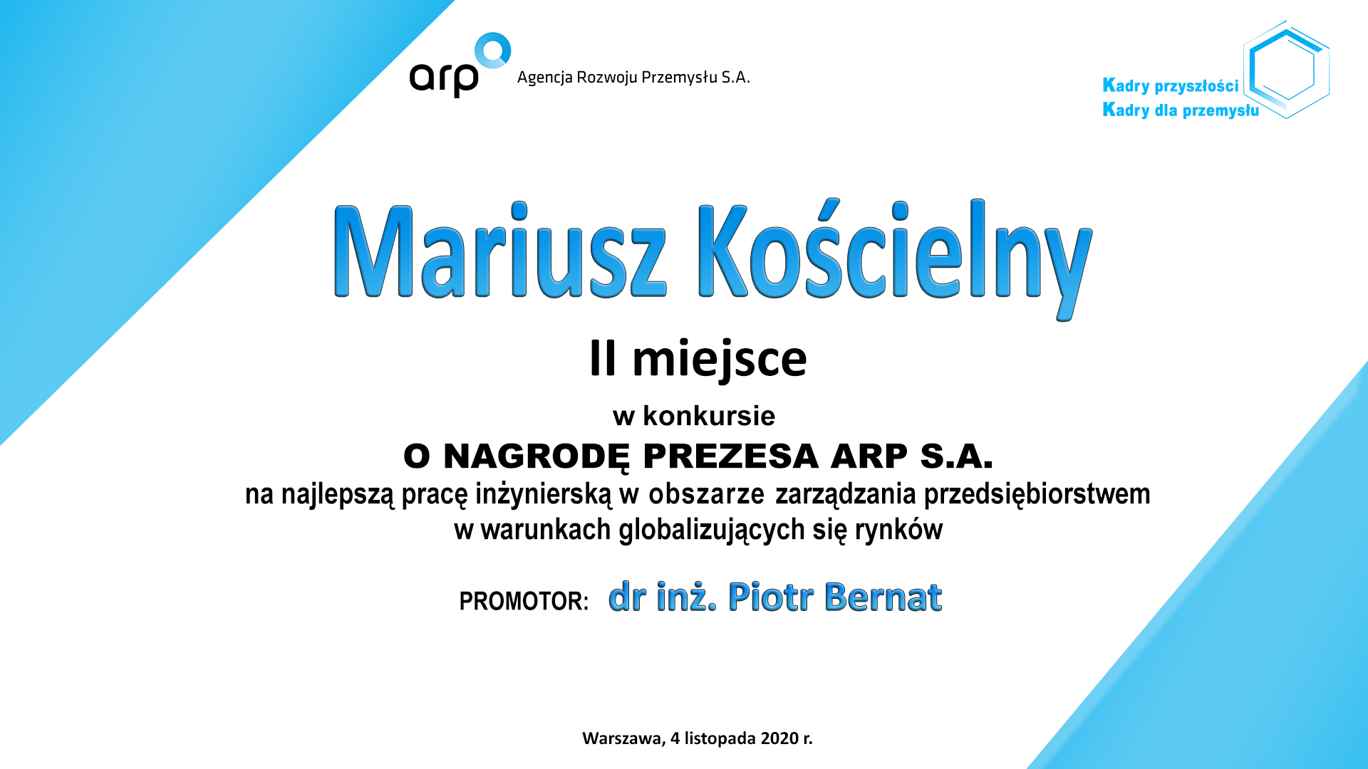 Pan Mariusz Kościelny, absolwent kierunku zarządzanie i inżynieria produkcji Państwowej Wyższej Szkoły Zawodowej w Nysie zajął II miejsce w konkursie o Nagrodę Prezesa Agencji Rozwoju Przemysłu S.A pod patronatem Premiera RP na najlepszą pracę inżynierską w obszarze zarządzania przedsiębiorstwem w warunkach globalizujących się rynków. Promotorem pracy inżynierskiej jest dr inż. Piotr Bernat.