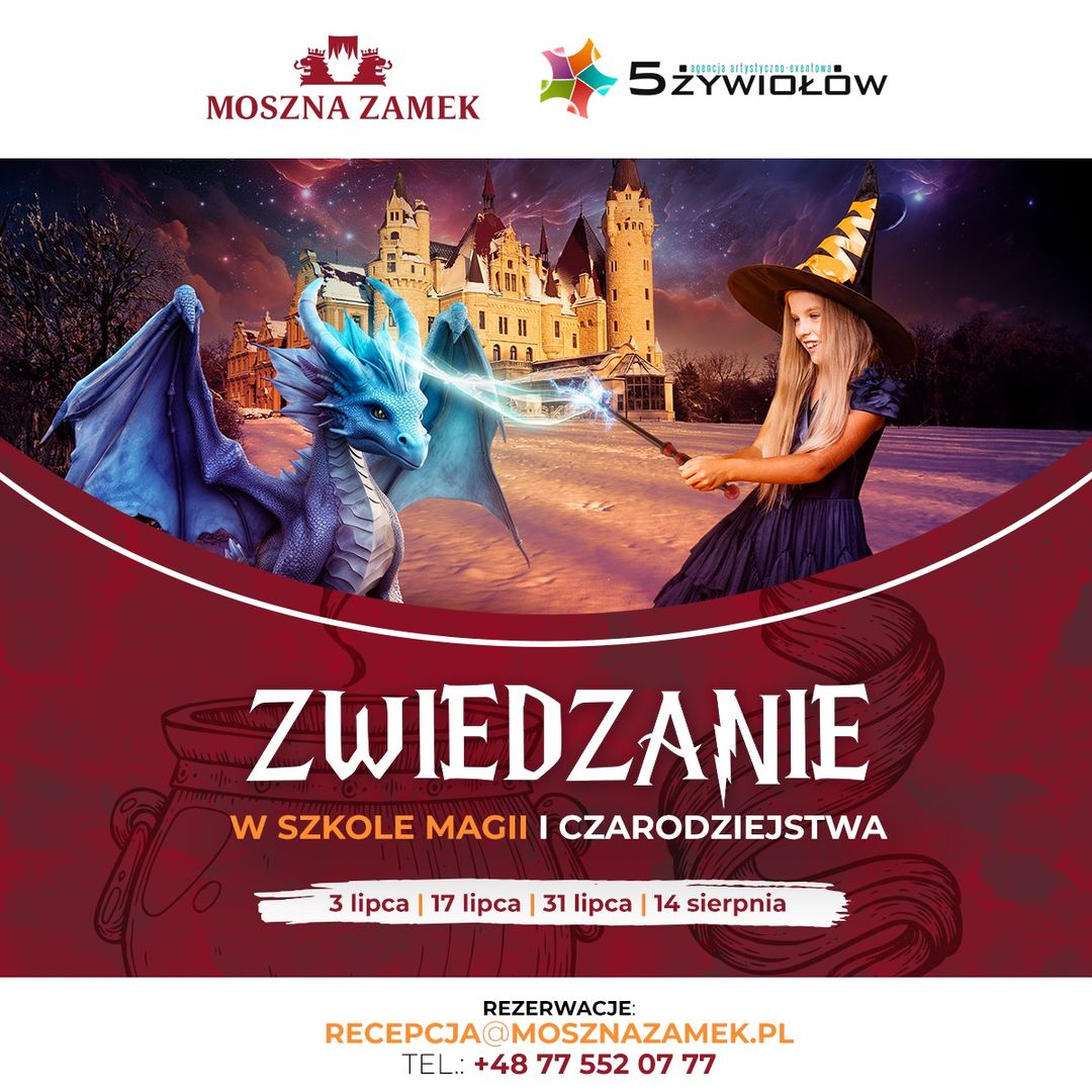 W wakacje zamek w Mosznej uruchomi Szkołę Magii. Będzie to specjalne wydanie zwiedzania tego niezwykłego obiektu w magicznej atmosferze, które odbędzie się w dniach: 3, 17 i 31 lipca oraz 14 sierpnia.