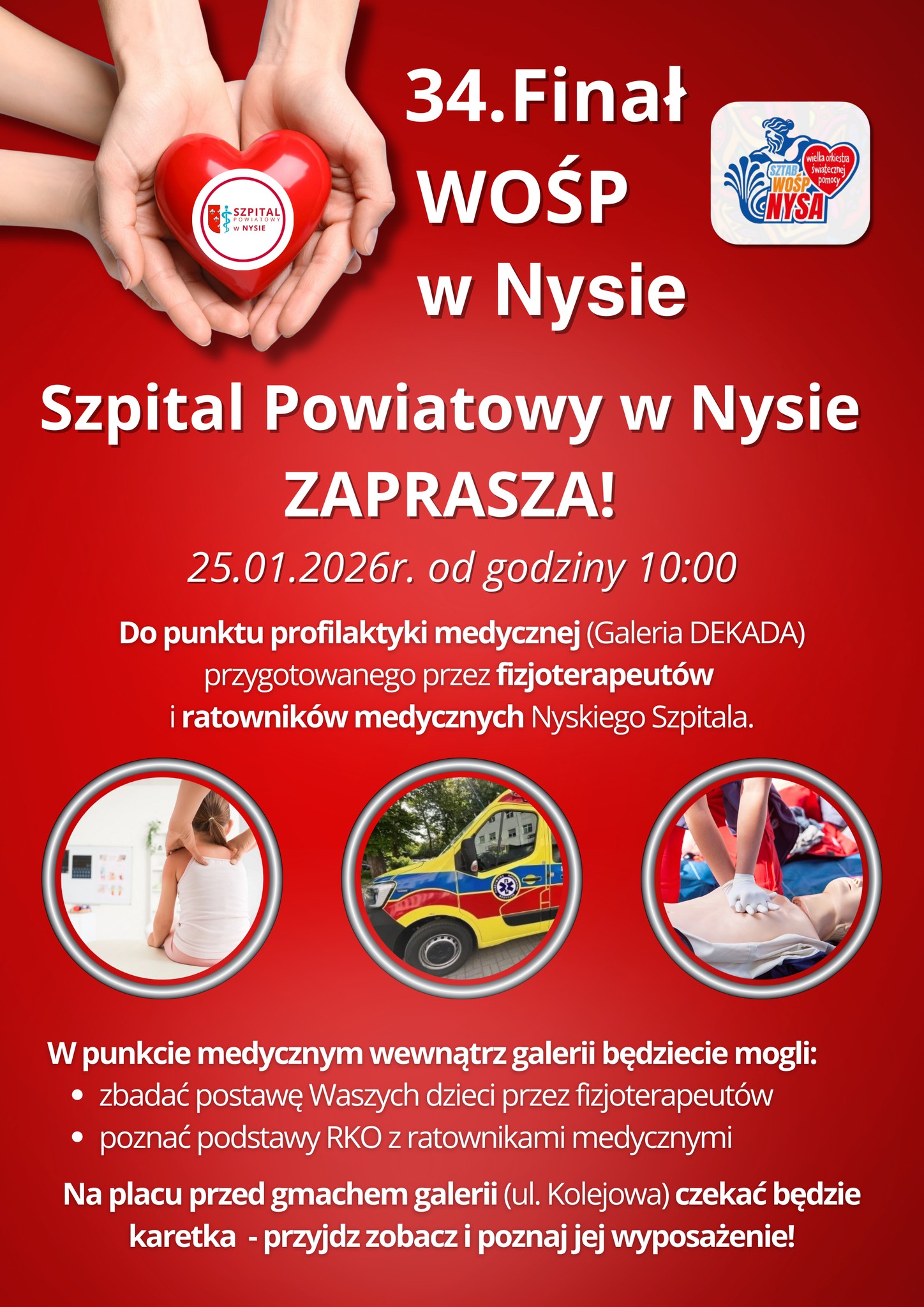 Drodzy Przyjaciele, 25.01.2026 (niedziela) od godz. 10:00 zapraszamy WAS wszystkich na 34. Finał WOŚP w Galerii Dekada! Koniecznie dołączcie do nas ! W punkcie medycznym czekają nasi superbohaterowie – ratownicy medyczni, którzy przypomną lub nauczą nas zasad RKO i fizjoterapeuci, którzy sprawdzą postawy ciała u dzieci. Pokażemy, jak ratować życie! Kto z Was będzie punktował z nami?