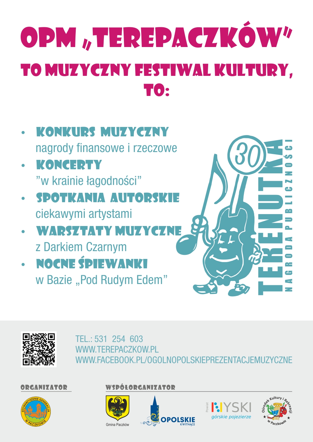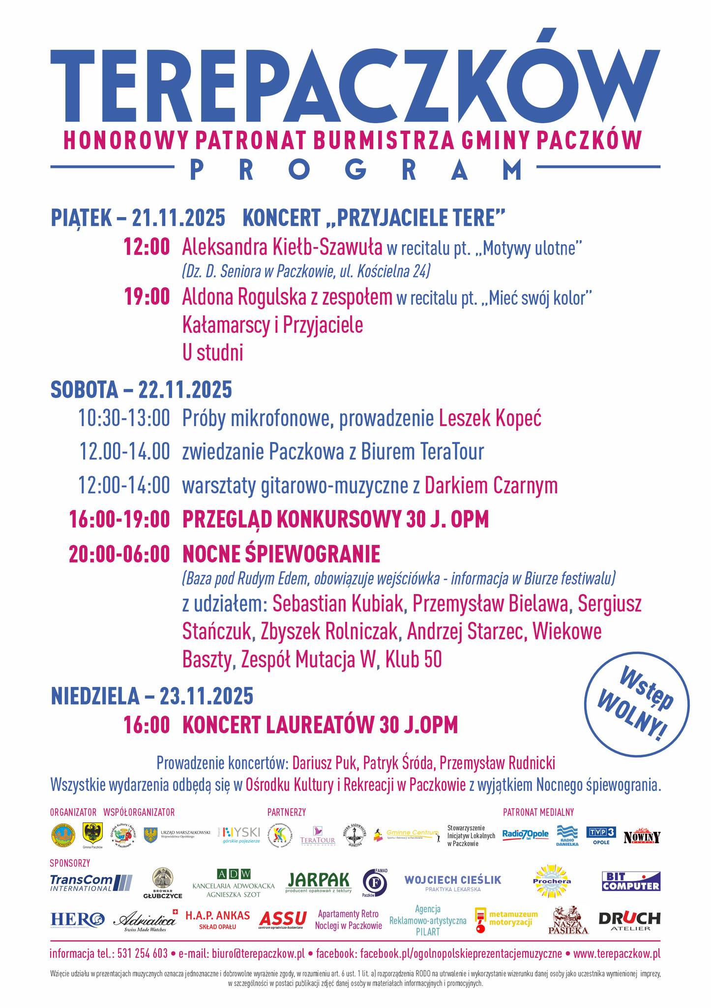 Paczków ponownie stanie się stolicą muzyki turystycznej i poetyckiej. W dniach 21–23 listopada 2025 roku odbędzie się jubileuszowa, 30. edycja Ogólnopolskich Prezentacji Muzycznych Terepaczków 2025. Festiwal organizowany przez stowarzyszenie Generacja i od lat gromadzi artystów i publiczność, którzy cenią klimat piosenki z nurtu „Krainy łagodności”.