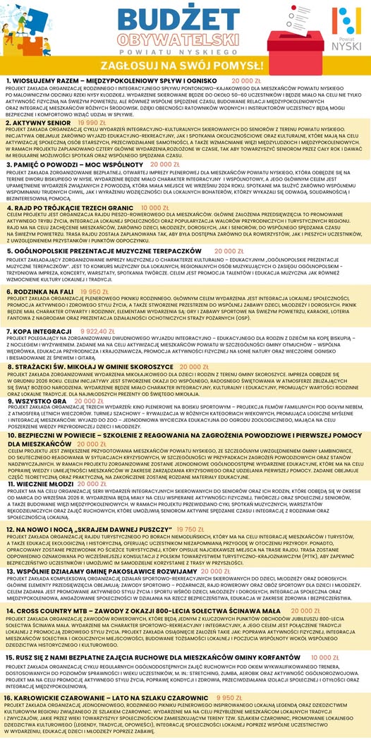 To doskonała okazja, by mieć realny wpływ na rozwój swojej okolicy. Mieszkańcy powiatu nyskiego zdecydują, które projekty zostaną zrealizowane – wystarczy oddać swój głos!