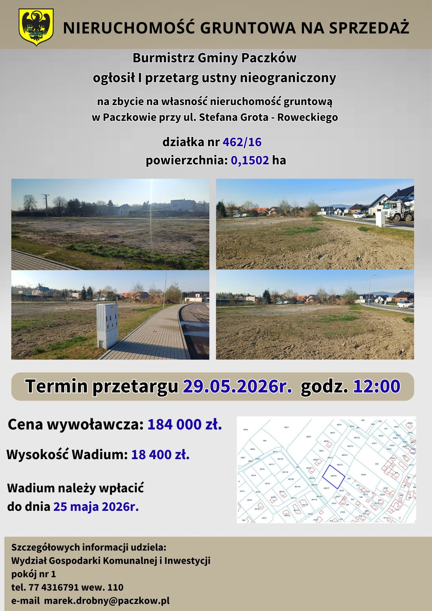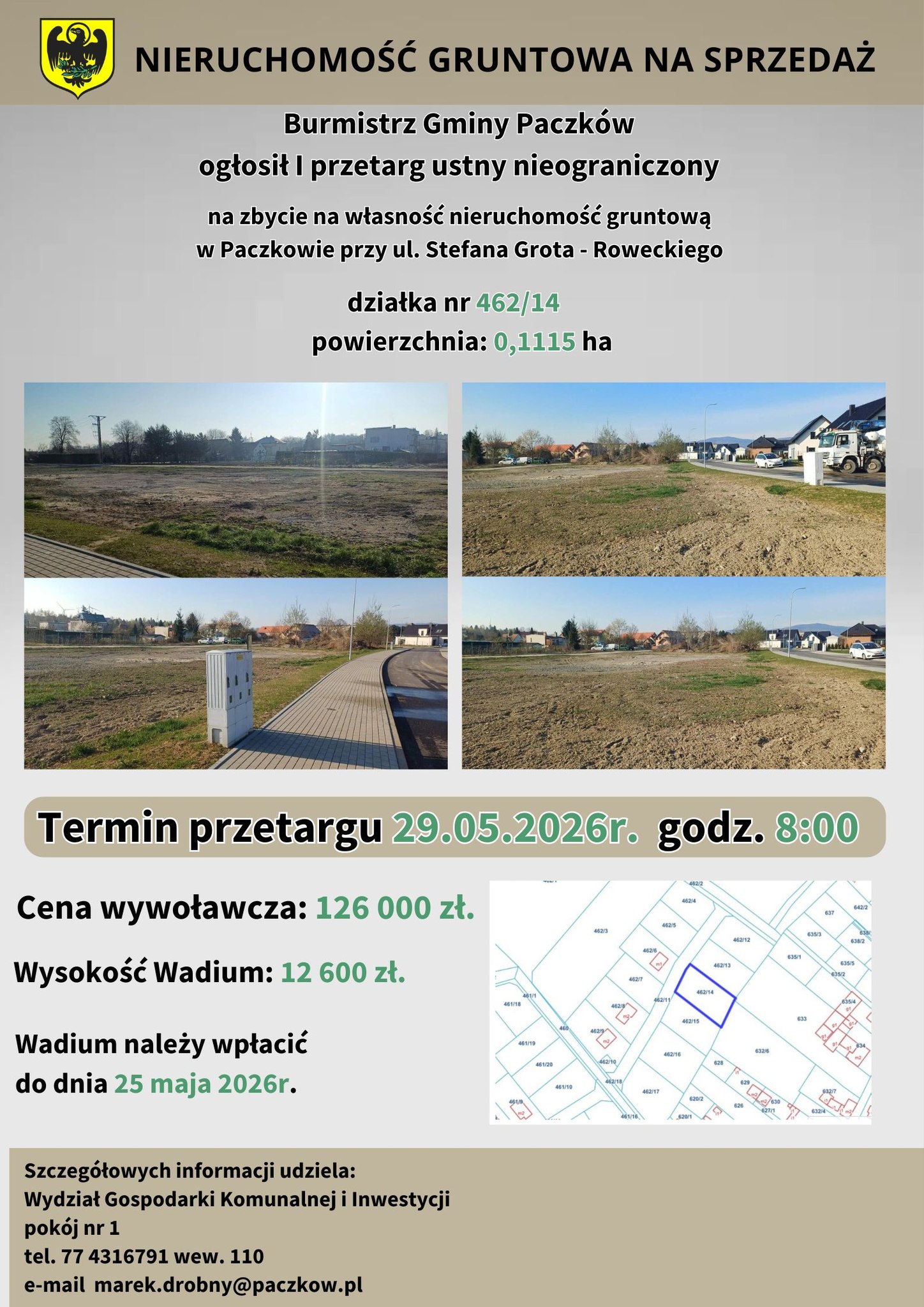Burmistrz Gminy Paczków informuje o ogłoszeniu przetargów na zbycie trzech nieruchomości gruntowych niezabudowanych, położonych w Paczkowie przy ul. gen. Stefana Grota-Roweckiego.