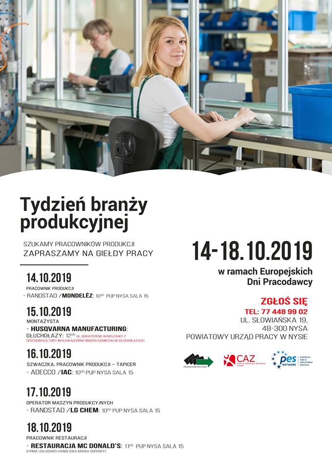 W dniach od 14.10.2019 r. do 18.10.2019 r. w siedzibie Powiatowego Urzędu Pracy w Nysie oraz w Centrum Kultury im Kawalerów Orderu Uśmiechu w Głuchołazach odbędzie się cykl spotkań rekrutacyjnych w zawodach produkcyjnych. Spotkania z pracodawcami odbywać się będą w ramach Tygodnia branżowego organizowanego przez PUP w Nysie.