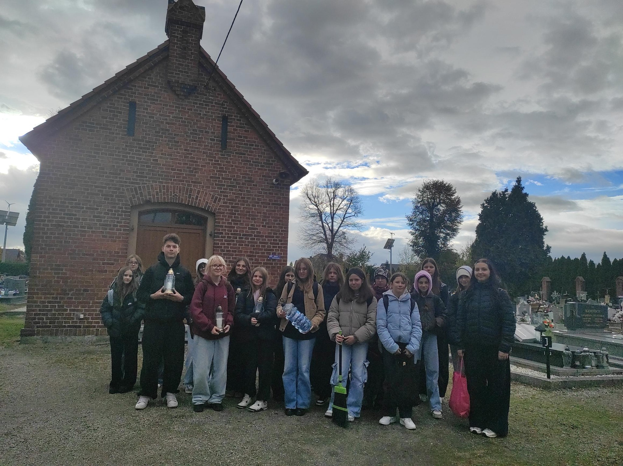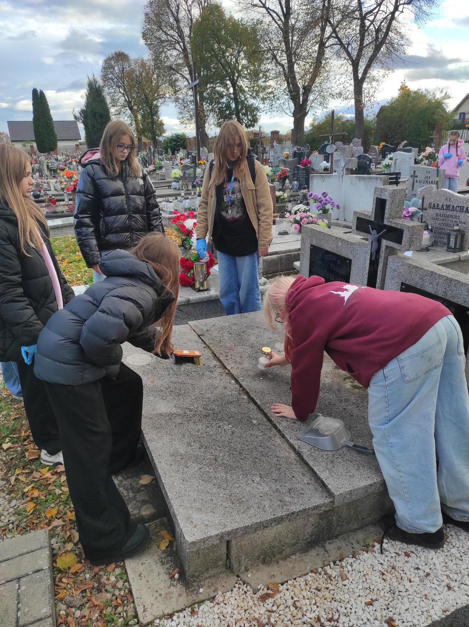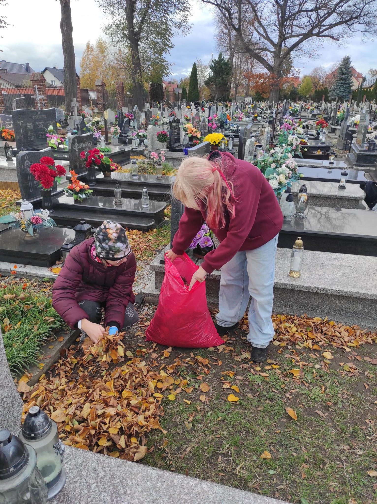 Wolontariusze wraz z opiekunami udali się na pobliski cmentarz w celu uporządkowania zaniedbanych, porośniętych trawą mogił, przynieśli znicze, worki, rękawice, wodę, narzędzia ogrodnicze i z zapałem zabrali się do pracy. Uczniowie uprzątnęli z nagrobków połamane gałęzie i jesienne liście, powyrywali też niepotrzebne chwasty. Usunęli również stare, potłuczone i wypalone znicze, a na ich miejsce zapalili nowe, chcąc uczcić w ten sposób pamięć zmarłych.