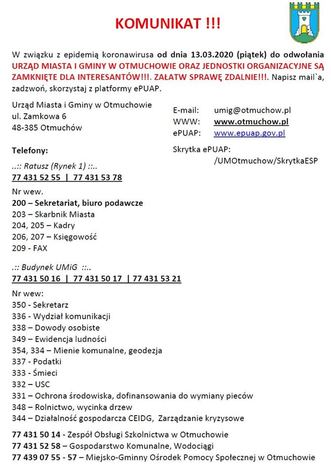Urząd Miasta i Gminy w Otmuchowie od piątku aż do odwołania będzie zamknięty dla interesantów, podobnie jak podległe mu jednostki organizacyjne.