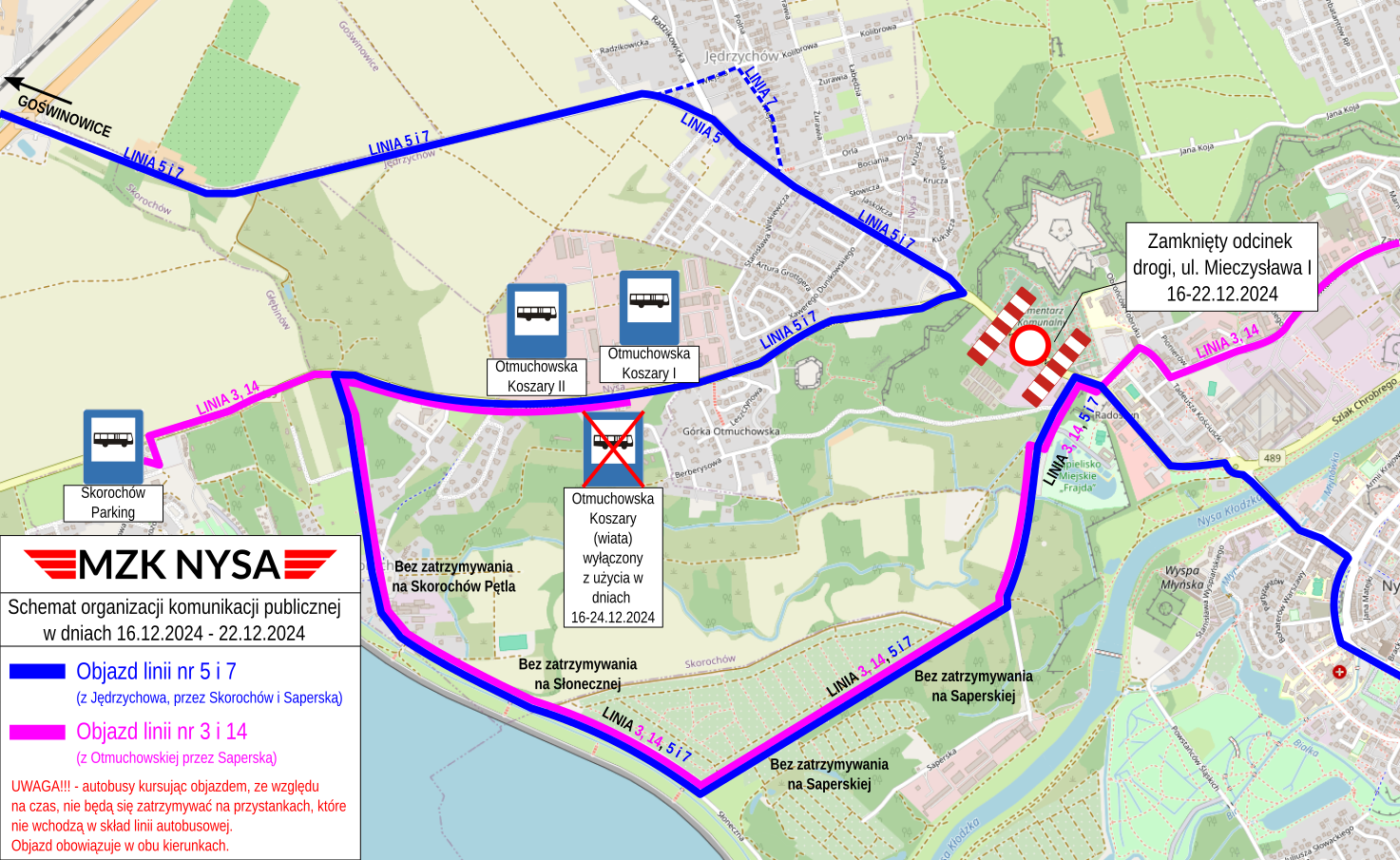 Miejski Zakład Komunikacji w Nysie informuje, że w dniach 16.12.2024 – 22.12.2024 spółka WiK AKWA w Nysie będzie prowadzić pracę związaną z usunięciem awarii na kanale sanitarnym przy ulicy Mieczysława I. W związku z powyższym zamknięta zostanie droga nr 489. Objazd został wytyczony przez Skorochów i ulicą Saperską.