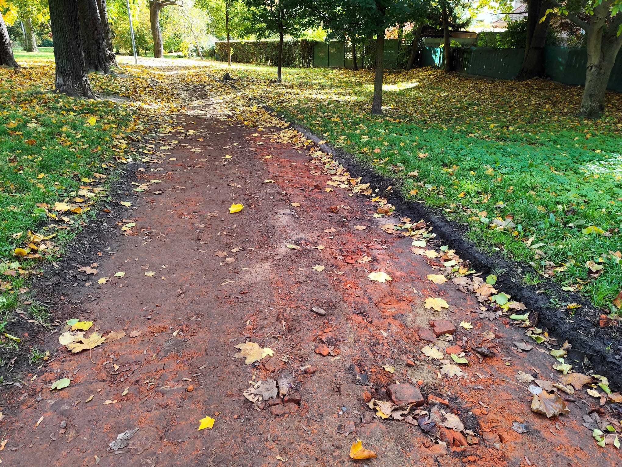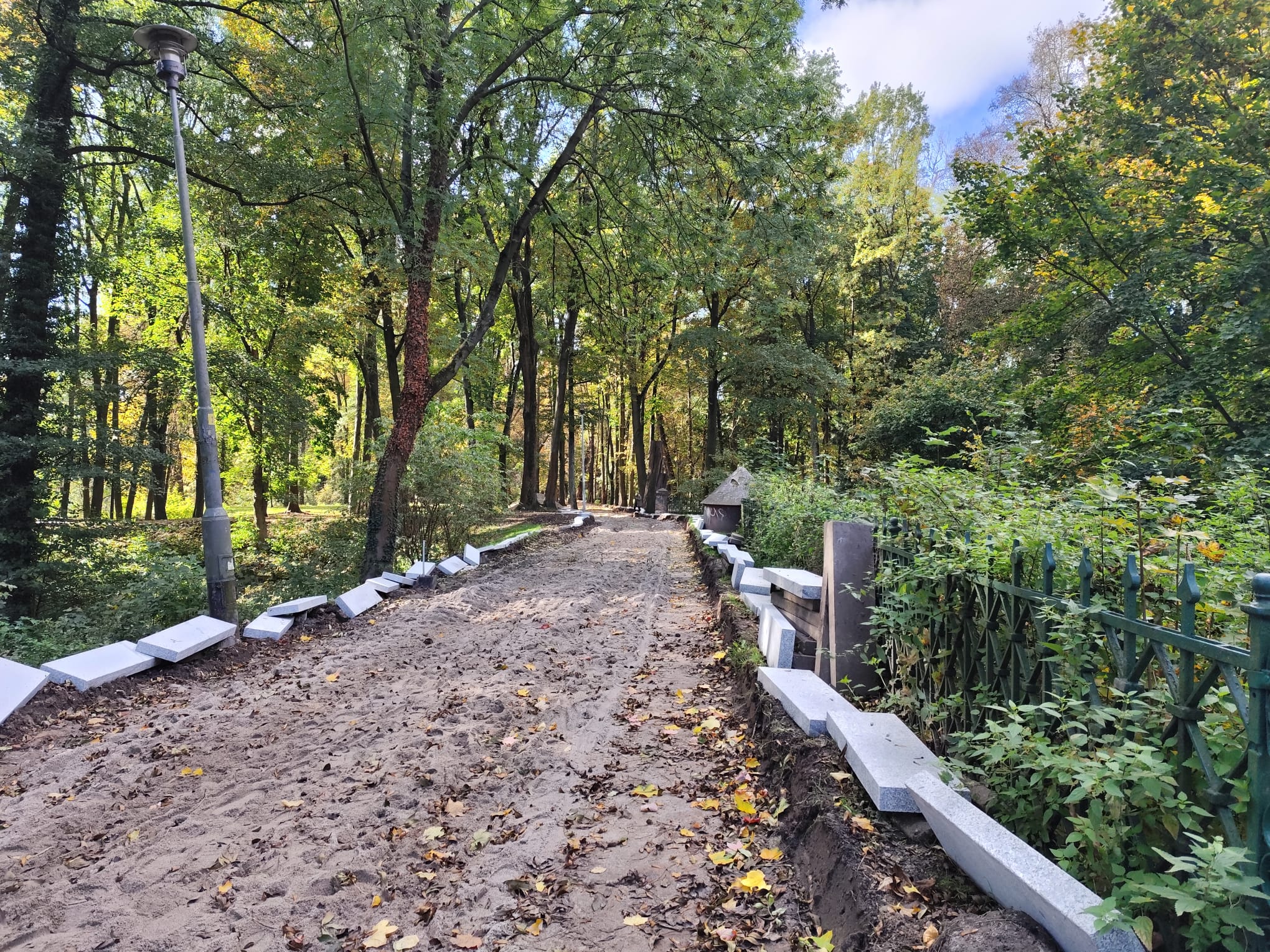 Wchodząc do parku od strony ulicy Bohaterów Warszawy od razu widać rozkopane ścieżki i znak informujący o zakazie wjazdu. Kiedy rozpoczęły się prace był tam także znak mówiący o terenie budowy i zakazie wstępu, którego już nie ma.
