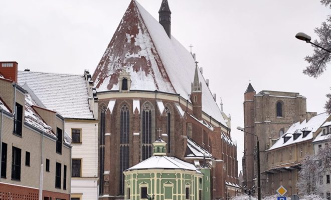 Obecnie śnieg pada nie tylko z chmur, ale także ześlizguje się z gzymsów, parapetów oraz dachów. Sporo śniegu zalega także na dachu kościoła św. Jakuba i Agnieszki.