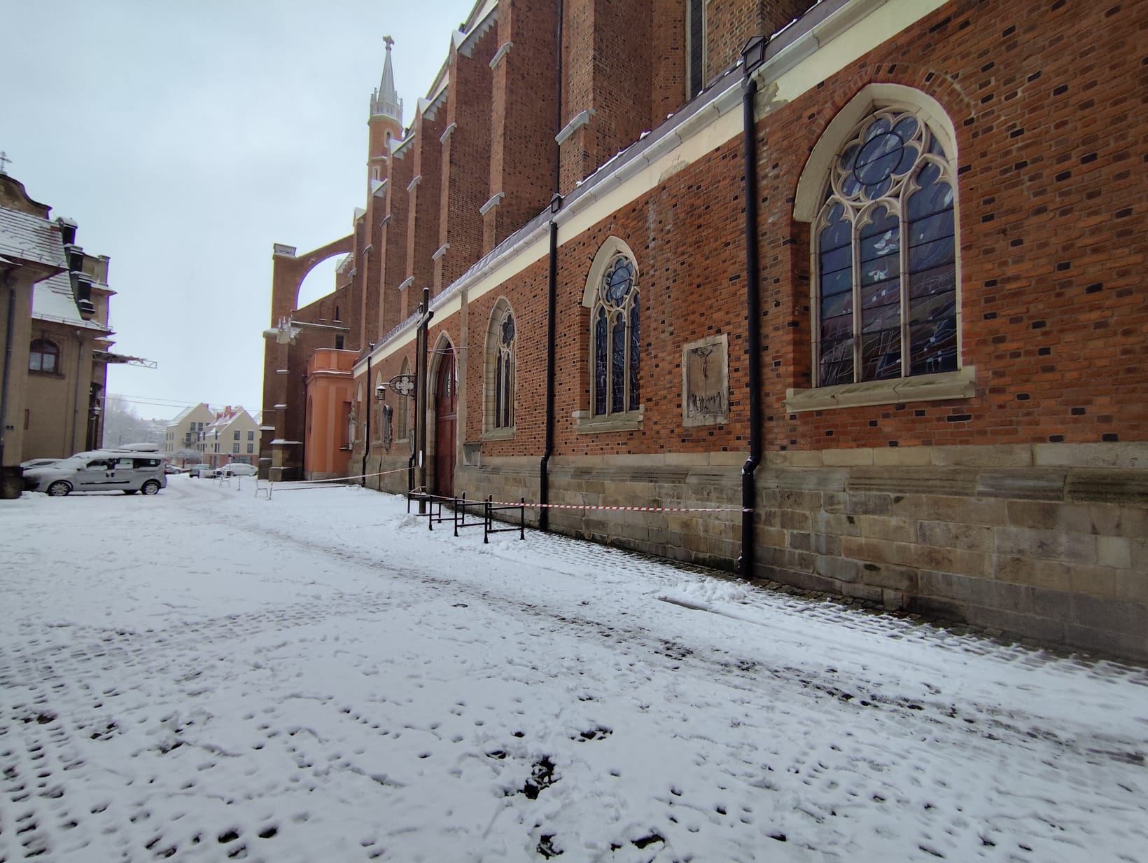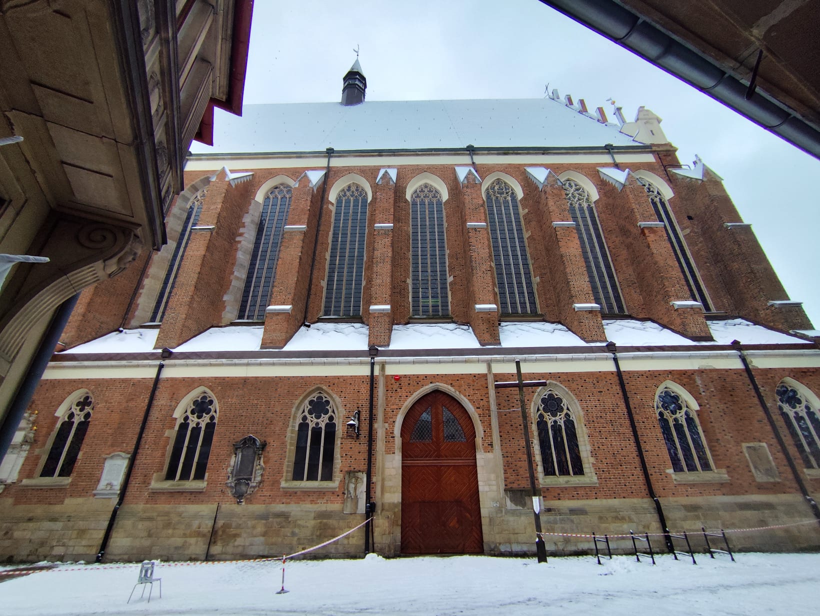 Dach nyskiej bazyliki to 4 tysiące m2 dachówek. Kalenica dachu od poziomu chodnika to prawie 60 metrów! Ostatnie intensywne opady mokrego śniegu zostawiły sporą warstwę na kościelnych dachówkach. Obecnie część terenu wokół kościoła jest odgrodzona. Warto uważać na siebie.