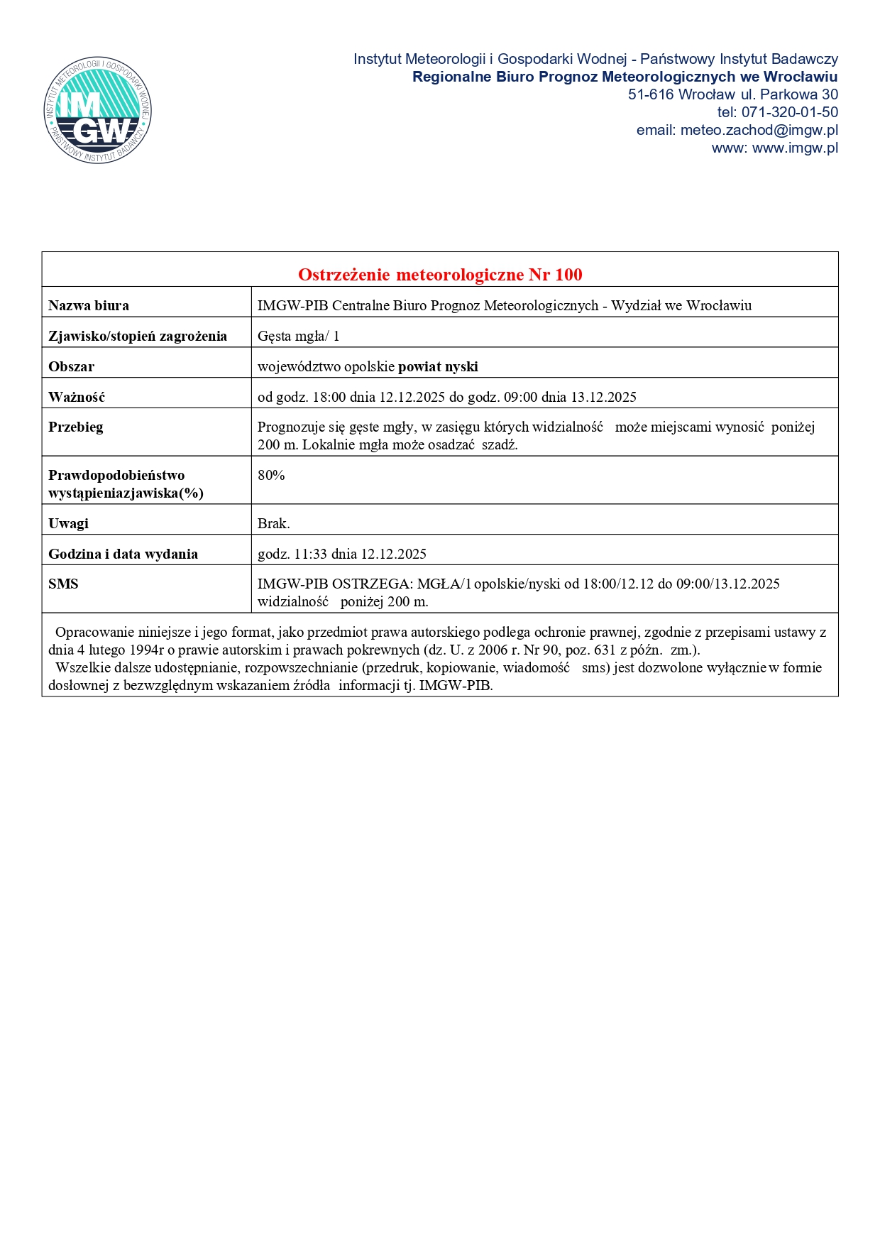 Instytut Meteorologii i Gospodarki Wodnej – Państwowy Instytut Badawczy Regionalne Biuro Prognoz Meteorologicznych we Wrocławiu wydało ostrzeżenie meteorologiczne dla całego województwa opolskiego.