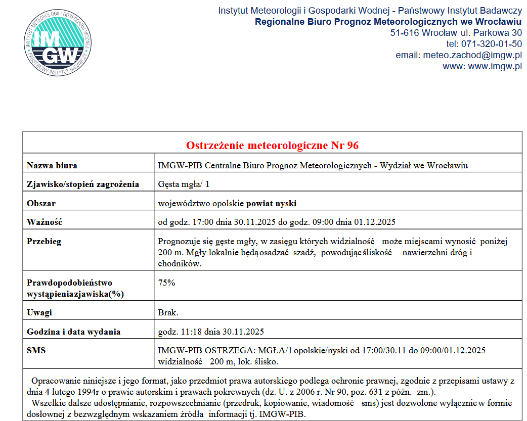 Instytut Meteorologii i Gospodarki Wodnej – Państwowy Instytut Badawczy, Regionalne Biuro Prognoz Meteorologicznych we Wrocławiu wydało ostrzeżenie meteorologiczne dla naszego regionu. Według synoptyków prognozuje się się gęste mgły, w zasięgu których widzialność może miejscami wynosić poniżej 200 m. Mgły lokalnie będą osadzać szadź, powodując śliskość nawierzchni dróg i