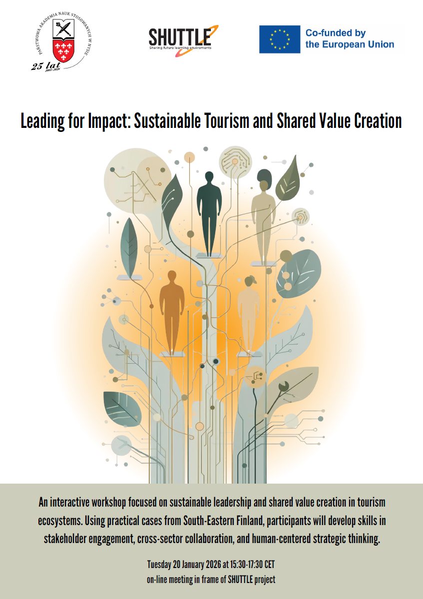 Warsztat będzie poświęcony zagadnieniom zrównoważonego przywództwa oraz tworzenia wspólnej wartości (shared value creation) we współpracy z partnerami z branży turystycznej z południowo-wschodniej Finlandii, w tym: Visit Kotka-Hamina, Kotka Maritime Festival.