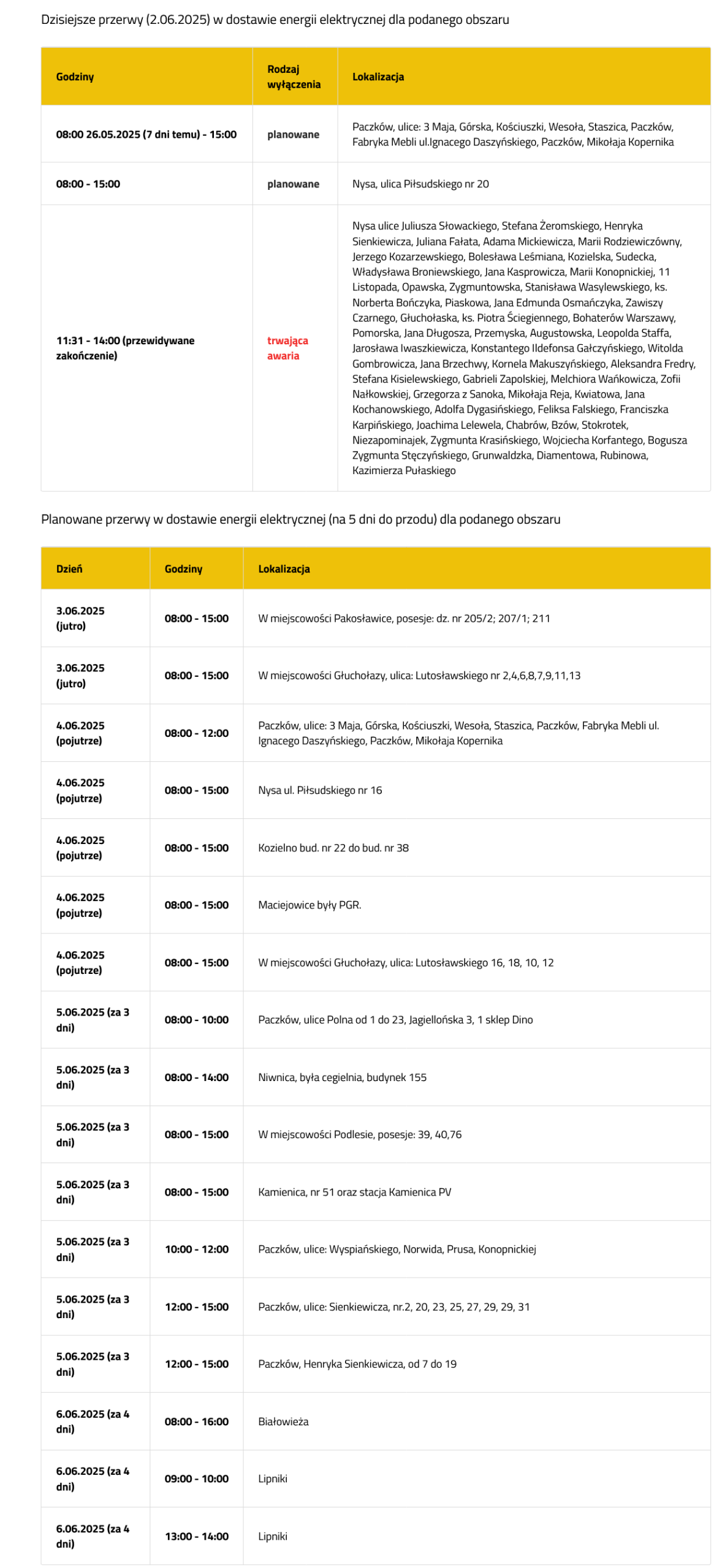 Awaria obejmuje ulice w Nysie: Juliusza Słowackiego, Stefana Żeromskiego, Henryka Sienkiewicza, Juliana Fałata, Adama Mickiewicza, Marii Rodziewiczówny, Jerzego Kozarzewskiego, Bolesława Leśmiana, Kozielska, Sudecka, Władysława Broniewskiego, Jana Kasprowicza, Marii Konopnickiej, 11 Listopada, Opawska, Zygmuntowska, Stanisława Wasylewskiego, ks. Norberta Bończyka, Piaskowa, Jana Edmunda Osmańczyka, Zawiszy Czarnego, Głuchołaska, ks. Piotra Ściegiennego, Bohaterów Warszawy, Pomorska, Jana Długosza, Przemyska, Augustowska, Leopolda Staffa, Jarosława Iwaszkiewicza, Konstantego Ildefonsa Gałczyńskiego, Witolda Gombrowicza, Jana Brzechwy, Kornela Makuszyńskiego, Aleksandra Fredry, Stefana Kisielewskiego, Gabrieli Zapolskiej, Melchiora Wańkowicza, Zofii Nałkowskiej, Grzegorza z Sanoka, Mikołaja Reja, Kwiatowa, Jana Kochanowskiego, Adolfa Dygasińskiego, Feliksa Falskiego, Franciszka Karpińskiego, Joachima Lelewela, Chabrów, Bzów, Stokrotek, Niezapominajek, Zygmunta Krasińskiego, Wojciecha Korfantego, Bogusza Zygmunta Stęczyńskiego, Grunwaldzka, Diamentowa, Rubinowa, Kazimierza Pułaskiego