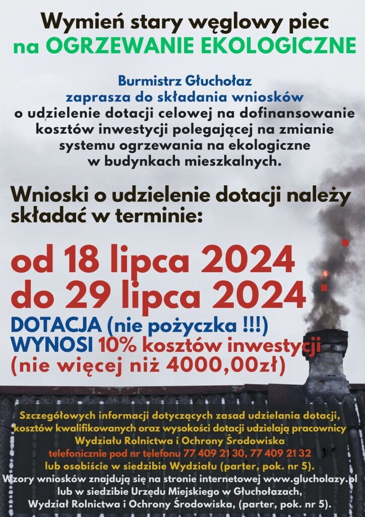 Burmistrz Głuchołaz ogłasza nabór wniosków o udzielenie dotacji celowej na dofinansowanie kosztów inwestycji polegającej na zmianie systemu ogrzewania na ekologiczne w budynkach mieszkalnych.