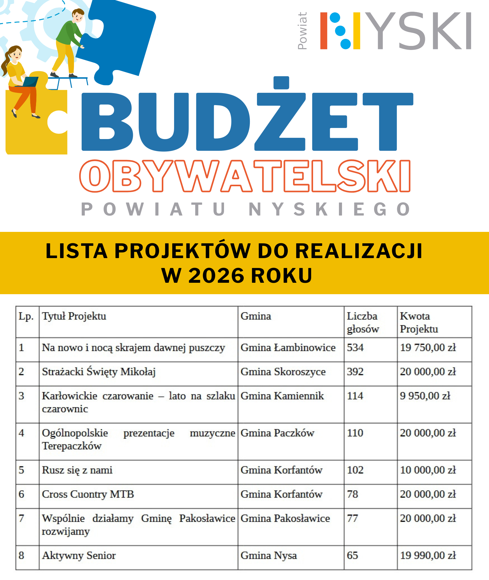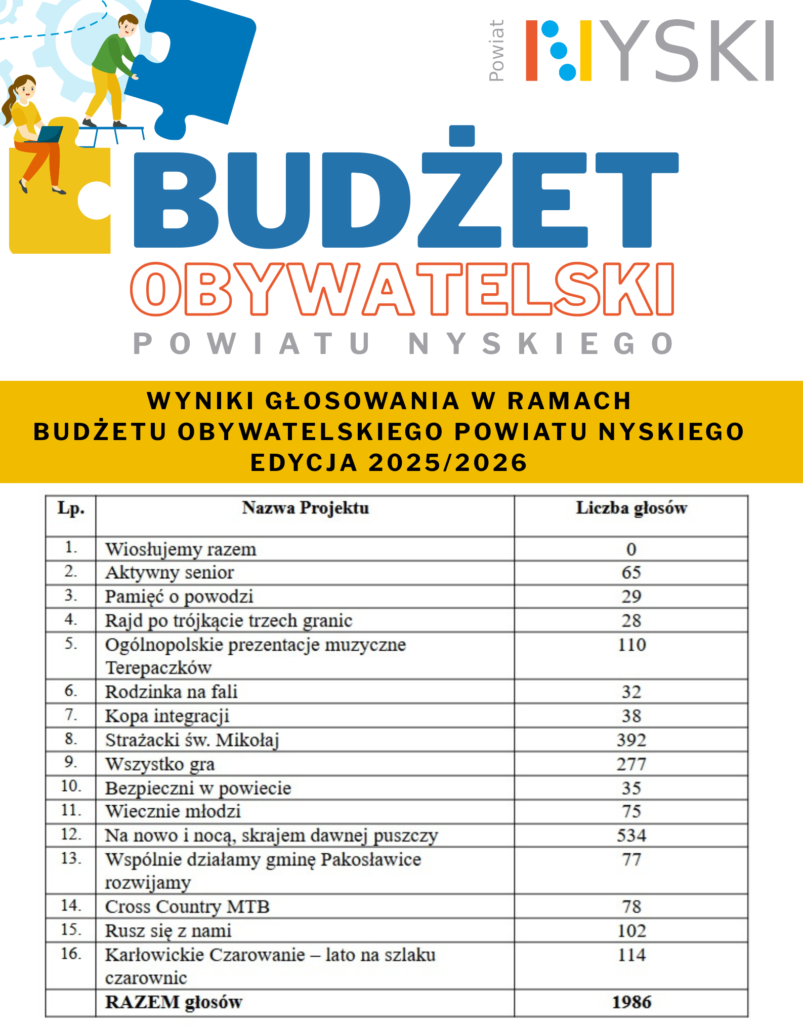 Wyniki głosowania w ramach Budżetu Obywatelskiego Powiatu Nyskiego edycja 2025/2026
