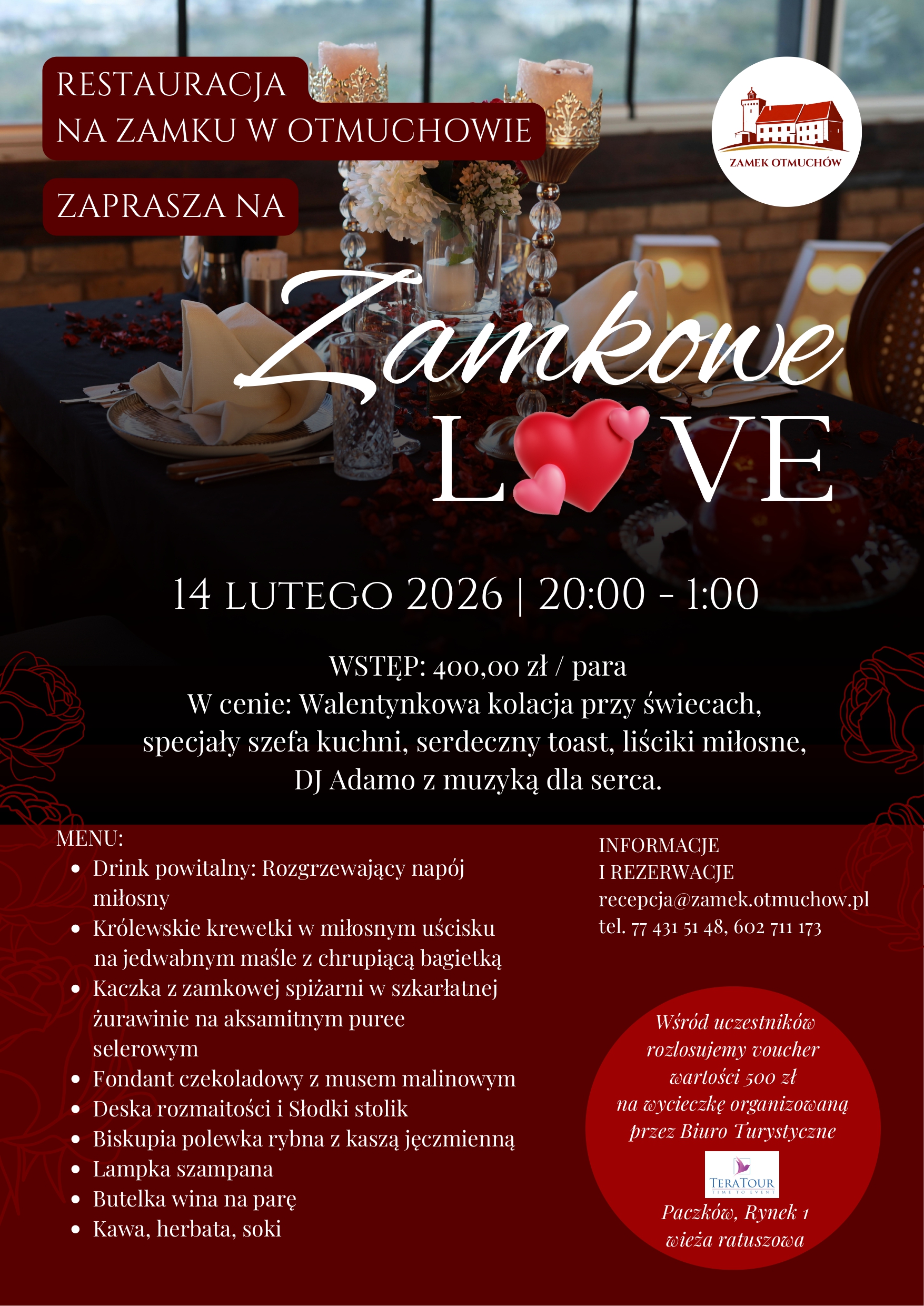 Restauracja na Zamku w Otmuchowie zaprasza zakochanych oraz wszystkich miłośników romantycznej atmosfery na niezwykłe wydarzenie walentynkowe „Zamkowe Love”, które odbędzie się 14 lutego 2026 roku w godzinach 20:00–1:00 w historycznych wnętrzach zamku.