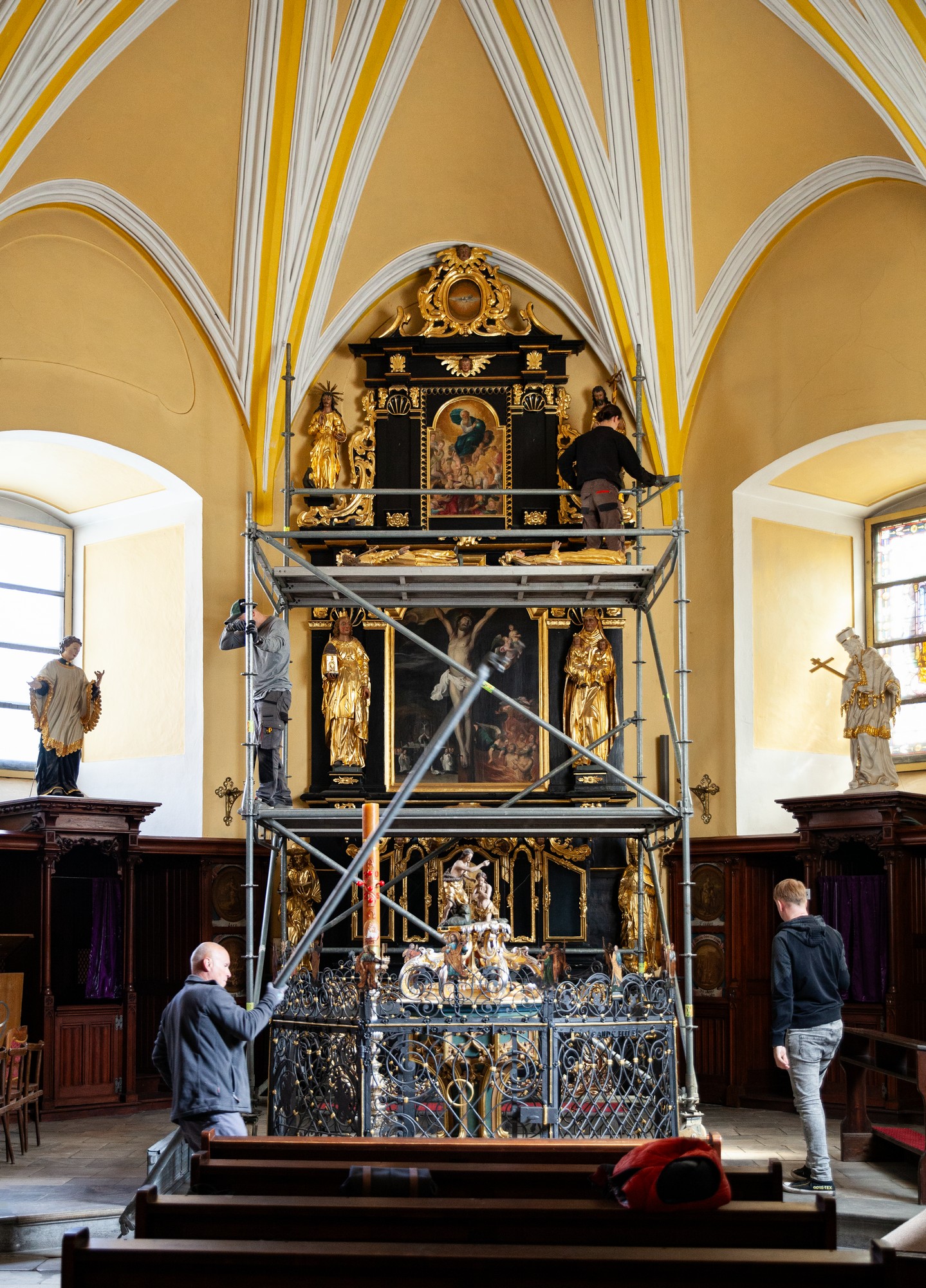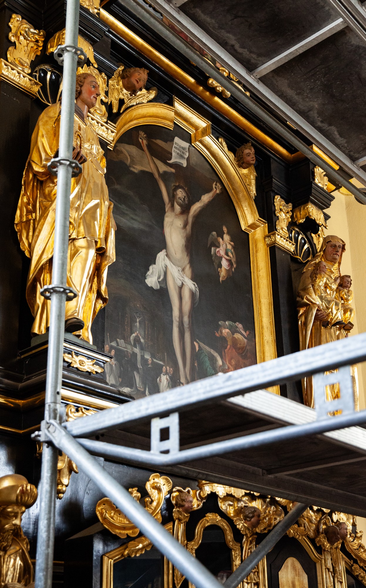 Jeden z najtrudniejszych demontaży za nami! Obraz „Ukrzyżowanie Chrystusa i Msza za dusze czyśćcowe” wg Petera Paula Rubensa przyjechał do nas z bazyliki św. Jakuba St. Apostoła i św. Agnieszki w Nysie. Demontaż trwał kilka godzin i wymagał ustawienia rusztowania fasadowego i użycia specjalnej techniki, by wydobyć obraz. Na czas wystawy w ołtarzu będzie prezentowana reprodukcja.