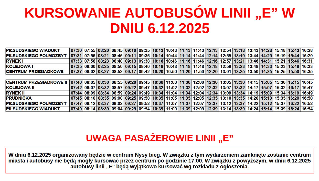 ROZKŁAD LINII “E” w dniu 6.12.2025: