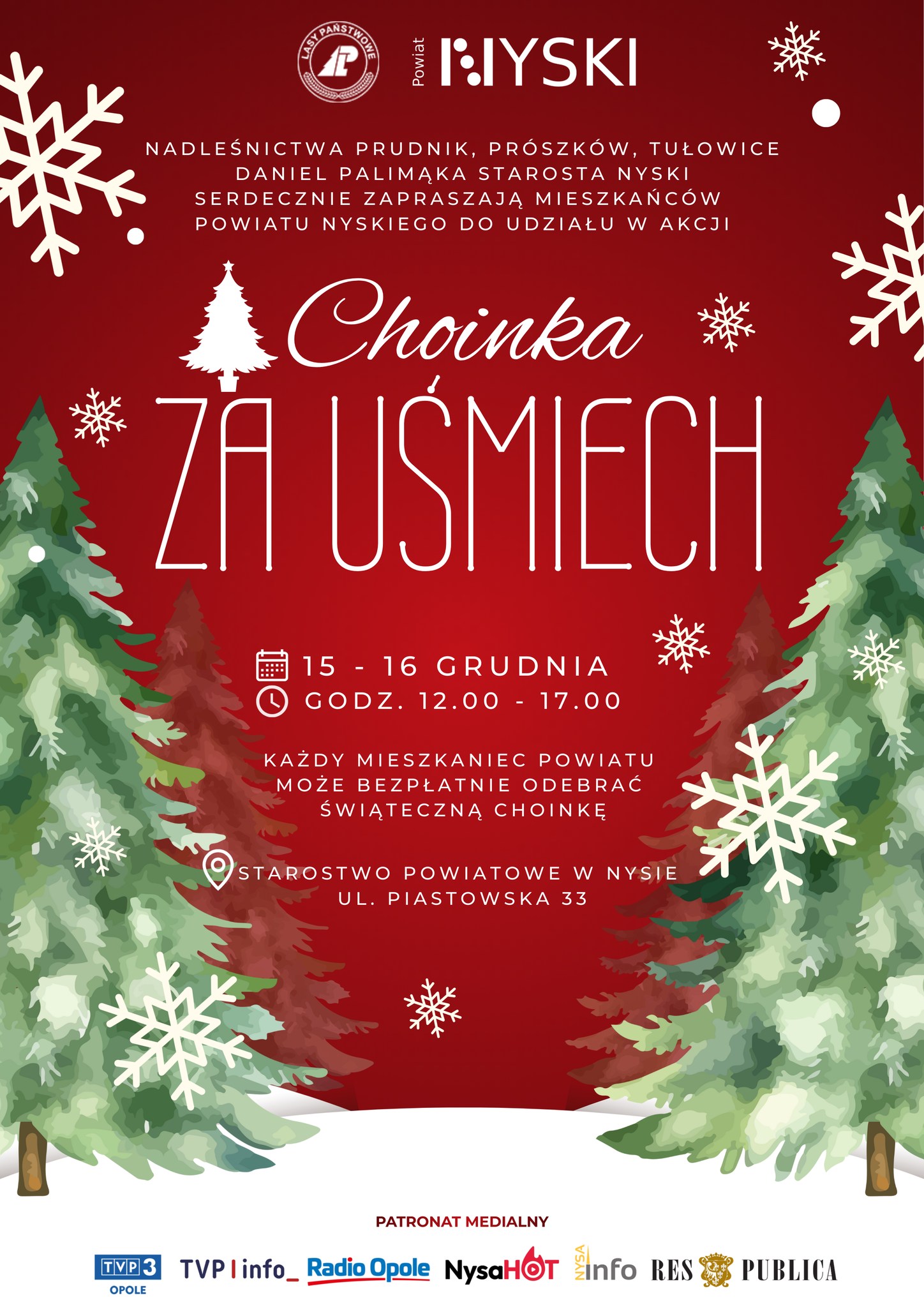 Nadleśnictwo Prudnik oraz Daniel Palimąka Starosta Nyski serdecznie zapraszają mieszkańców powiatu do udziału w akcji “Choinka za uśmiech”.