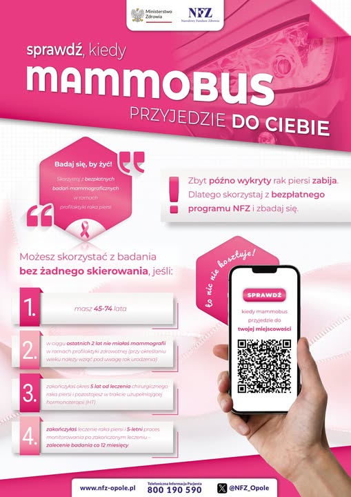 Opolski Oddział Wojewódzki Narodowego Funduszu Zdrowia w Opolu zaprasza mieszkanki powiatu nyskiego na badania mammograficzne.