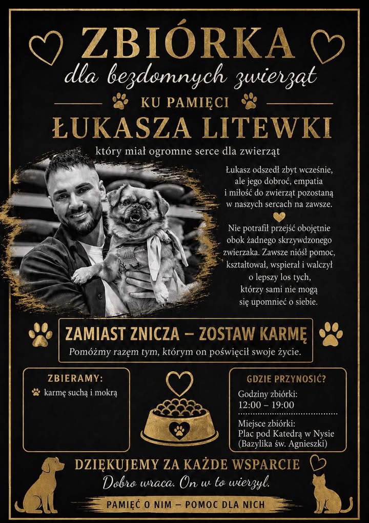 W Nysie zaplanowano zbiórkę dla bezdomnych zwierząt – ku pamięci Łukasza Litewki. Karma będzie zbierana dziś tj. 29.04, jednak jak podkreślają organizatorzy – jest to spontaniczna akcja, która być może zostanie przedłużona.
