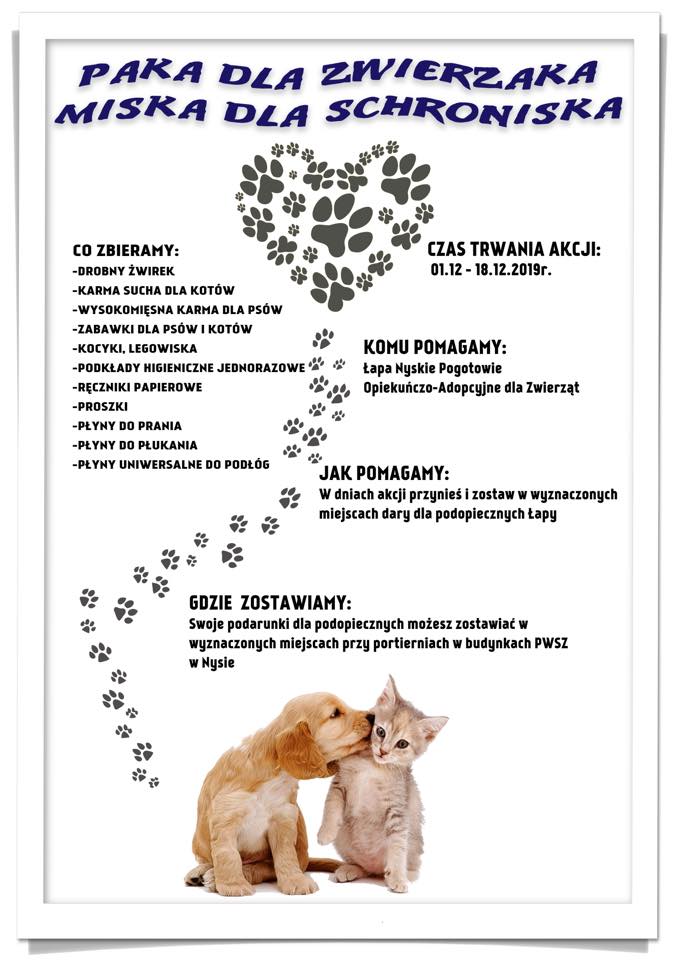 Studenci PWSZ ogłosili zbiórkę na rzecz zwierząt. Zebrane artykuły trafią na rzecz Nyskiego Pogotowia Opiekuńczo-Adopcyjnego dla Zwierząt Łapa.