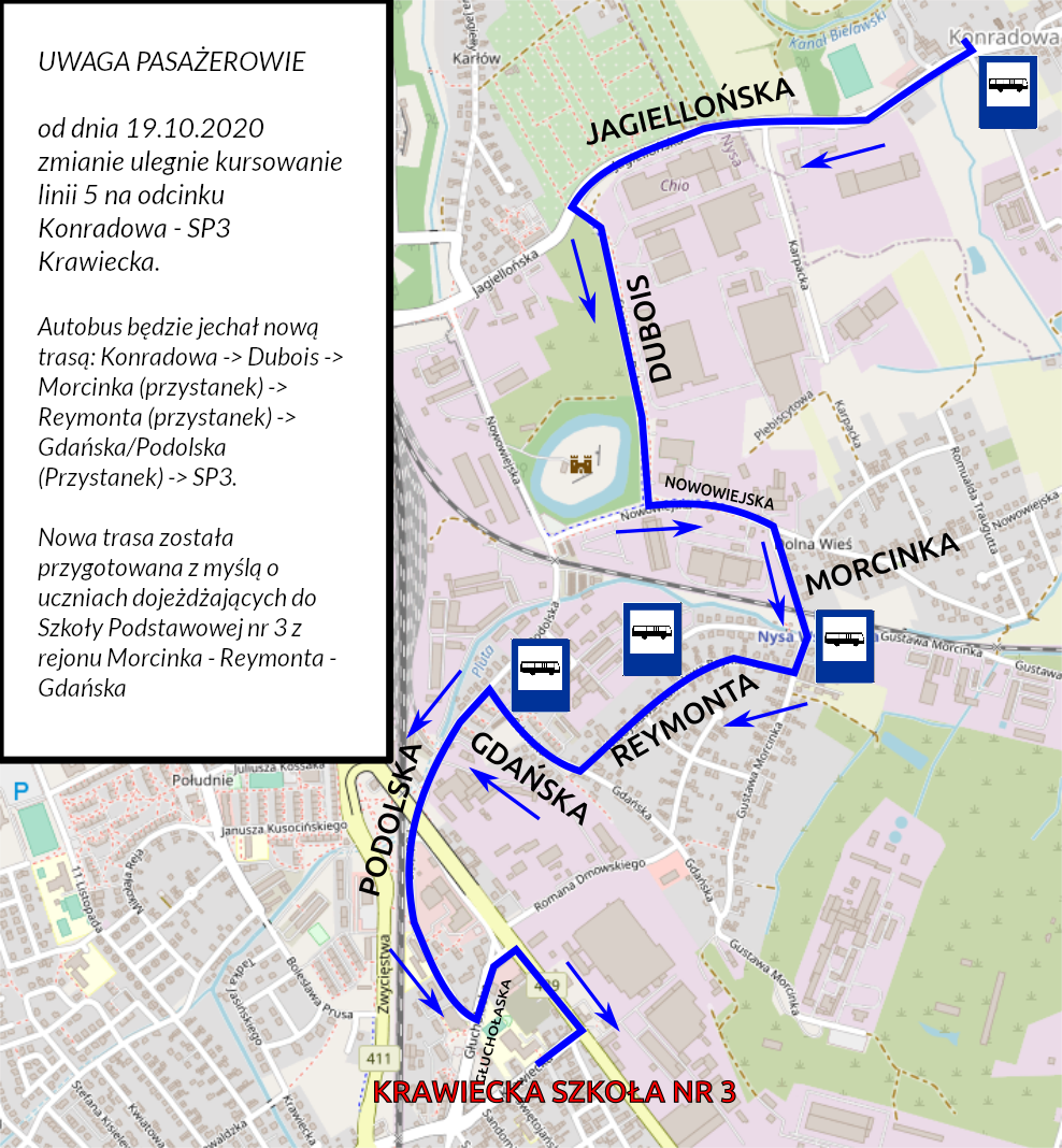 MZK w Nysie informuje, że od dnia 19.10.2020 kurs autobusu linii 5 na odcinku Konradowa – SP3 ulegnie zmianie. Do tej pory autobus kursował z Konradowej bezpośrednio do szkoły przy ul. Krawieckiej. Od poniedziałku (19.10) autobus z Konradowej pojedzie dodatkowo przez Morcinka, Reymonta i Gdańską/Podolską.