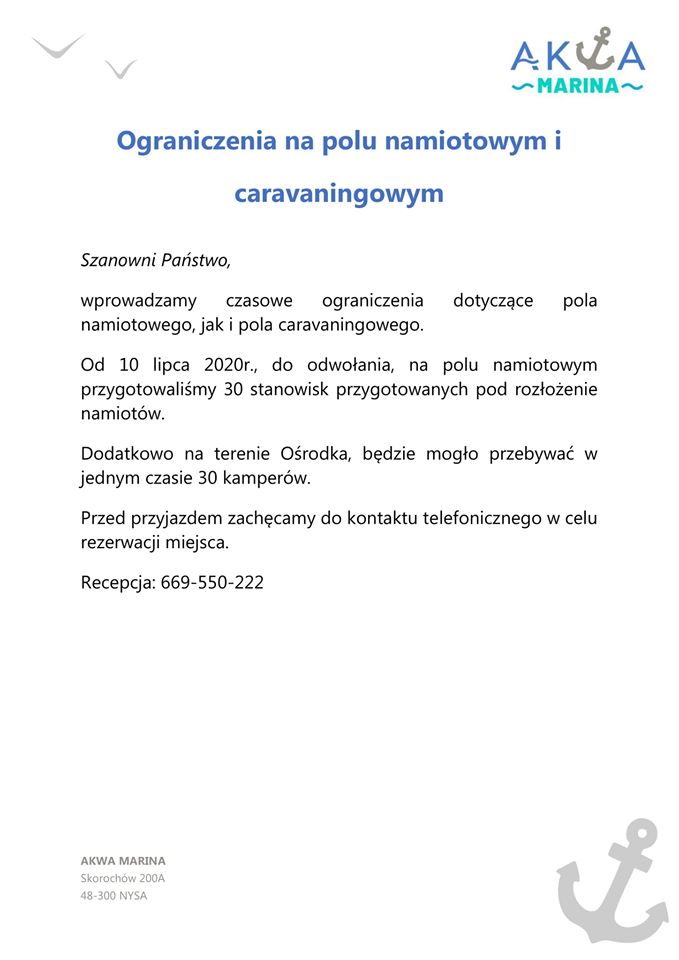 Wypady pod namiot zawsze charakteryzowały się pewną magią i klimatem, tym bardziej, że w sezonie próżno było szukać wolnych miejsc w domkach, natomiast jeszcze jeden namiot zawsze się zmieści. W związku z COVID-19 spółka AWKA, która zarządza ośrodkiem rekreacji była zmuszona do ograniczenia liczby namiotów. Ilość miejsc została ograniczona do 1/3 pierwotnej liczby.