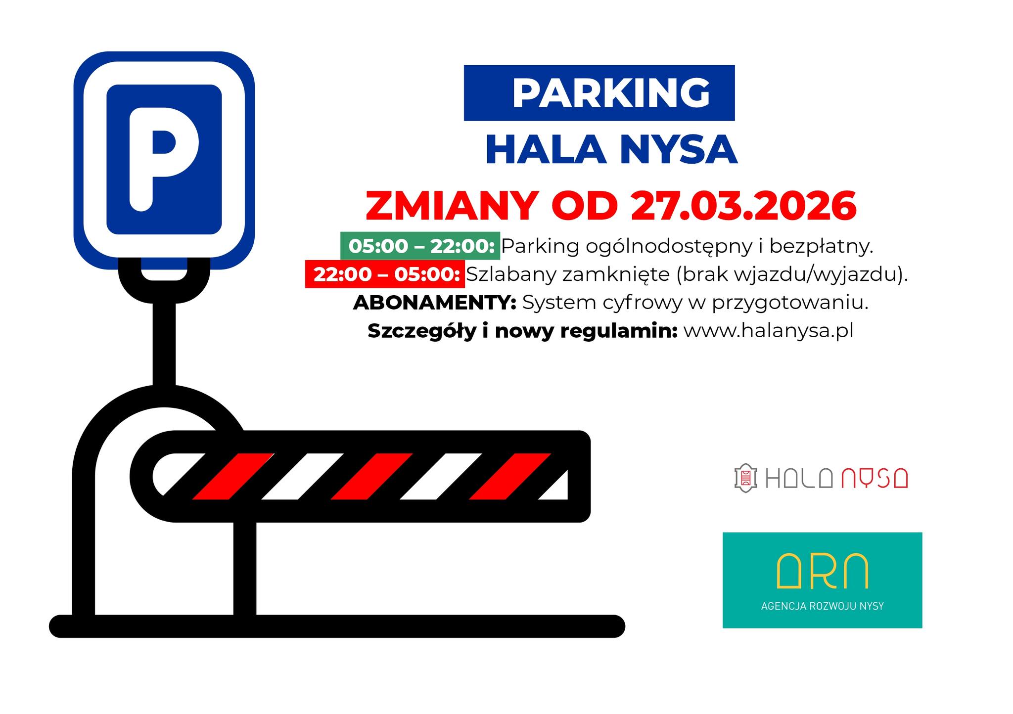 ARN – Agencja Rozwoju Nysy Sp. z o.o. informuje, że z dniem 27 marca 2026 r. wchodzą w życie zmiany w regulaminie korzystania z parkingu przy Hali Sportowo-Widowiskowej HALA NYSA (ul. Sudecka 23).