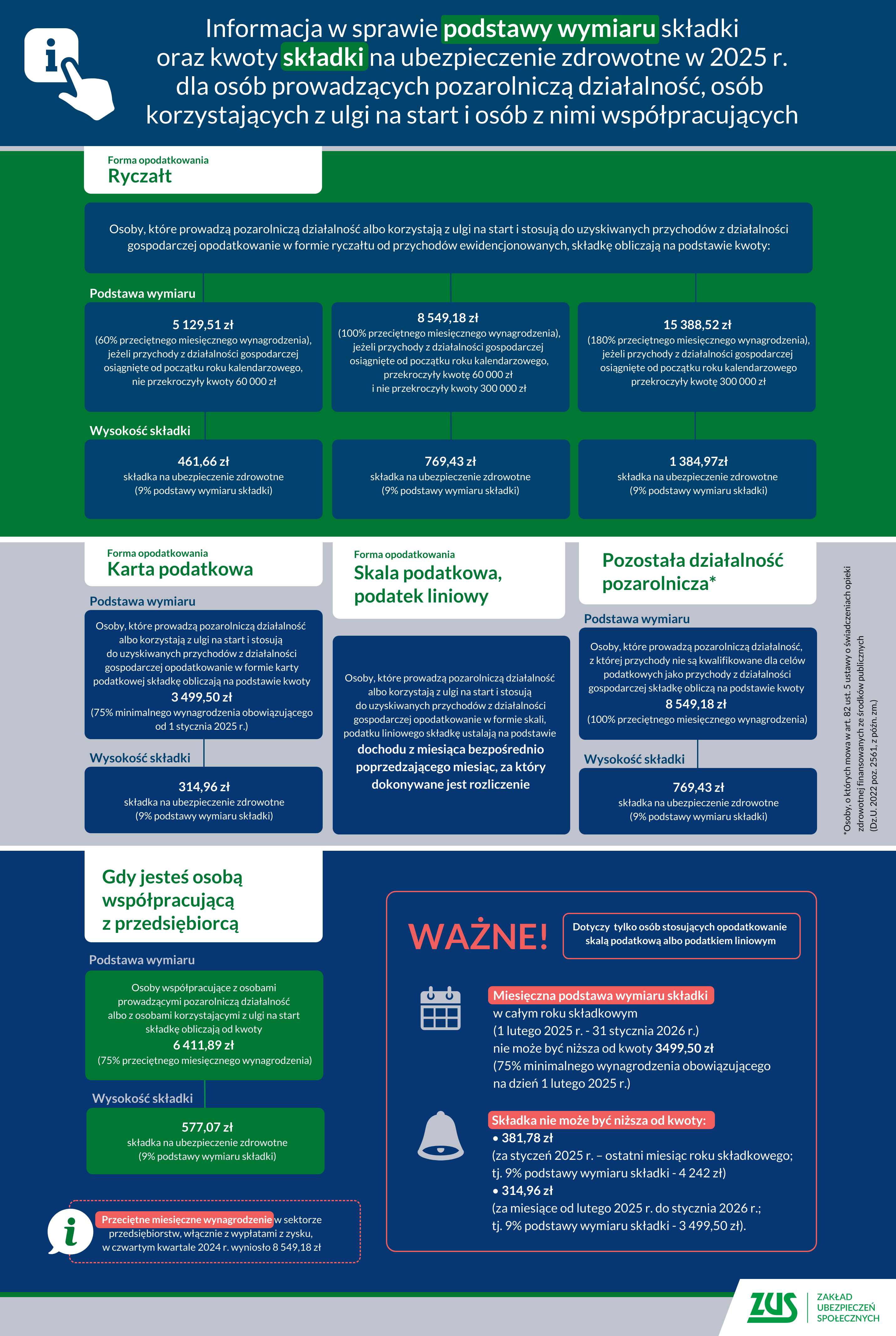 ZUS opublikował szczegółowe informacje o wysokości składki zdrowotnej dla firm na swojej stronie internetowej. Jest tam dostępny również kalkulator, który pomaga obliczyć składkę zdrowotną w zależności od formy opodatkowania i wybranego miesiąca.